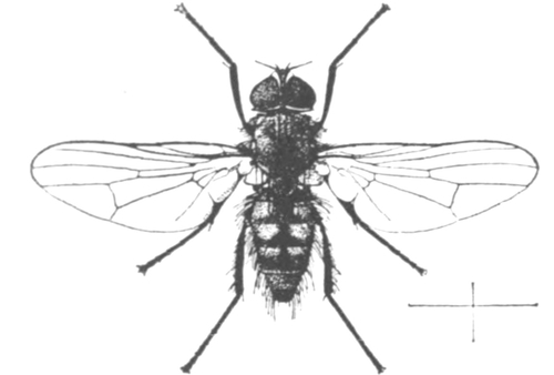 The Anthomyidæ are a family of about 250 small and medium sized garden frequenting and country flies, mainly of flower and honey seeking habits. Nevertheless, some are dung-frequenting; none are blood-sucking, but several are cattle-pestering sweat-flies, which, even more pertinaciously than the house-fly, will circle round one's head and repeatedly buzz against one's face. Of these, the small Hydrotœa irritans and Hy. dentipes are amongst the worst offenders. A few of the Anthomyidæ are vegetarian garden pests; the larvæ of the cabbage-fly, the root-fly, the onion-fly and the celery-fly are, in some seasons, very destructive. The so-called "turnip-fly" is a small striped beetle of the same genus, Phillotreta, as the unstriped "flea-beetle" of the hop-fields. The larvæ of the majority of the species of the family of Anthomyidæ are, more or less, feeders on decadent vegetable matter, but some, like those of the genus Fannia, are preferentially feeders on dung. The female of the latrine fly, Fannia scalaris, so closely resembles the lesser house-fly that only the expert with a magnifying glass, after a careful examination, can tell which is which; the male differs from the male of the lesser house-fly by being without the yellowish patches on the abdomen.
