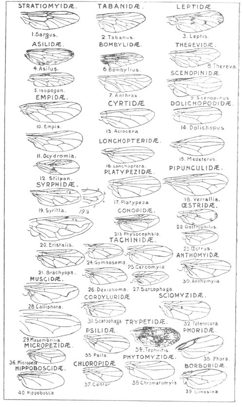 The second sub-division comprises many families, including the muscid-like flies, of which the house-fly is the type. The flies of this type are to be found in the families of Muscida, Anthomyida, Tachinida, and Cordylurida, comprising nearly 700 British species, of which many rather closely resemble one another when superficially observed.