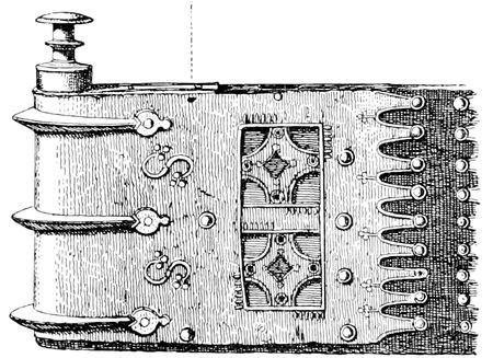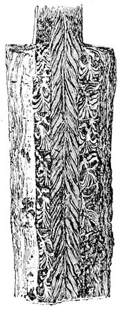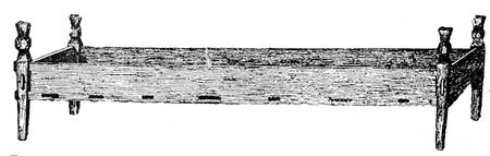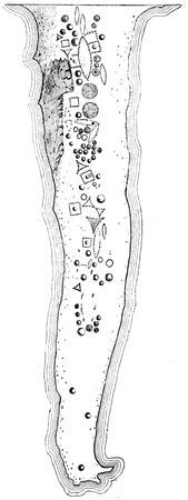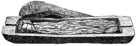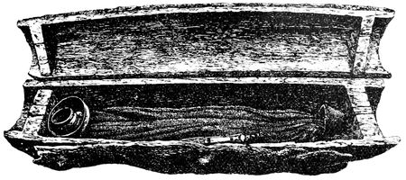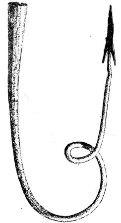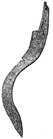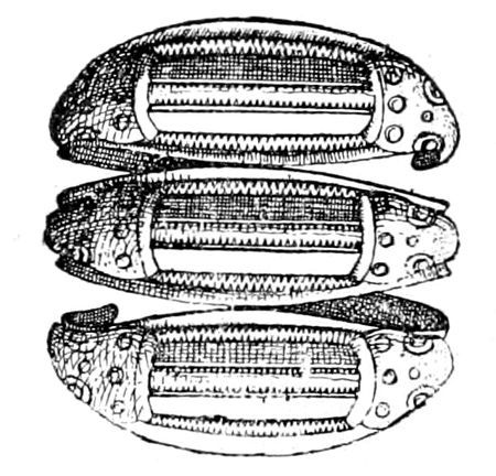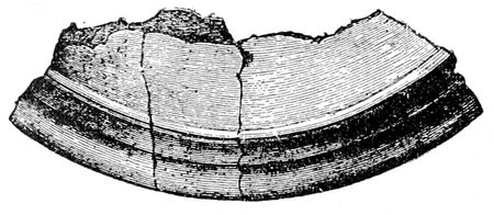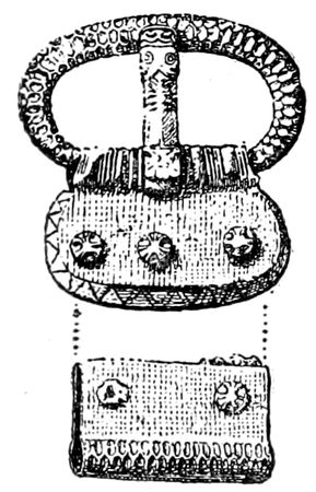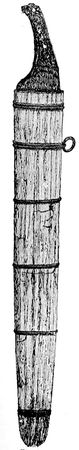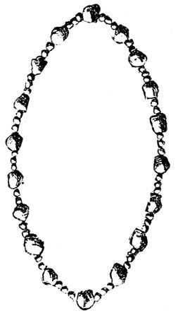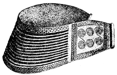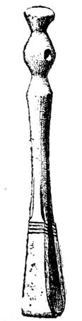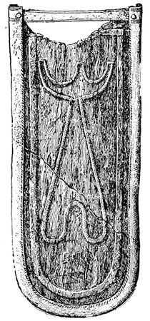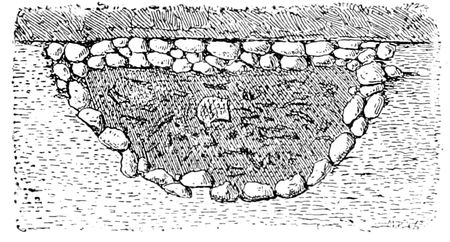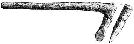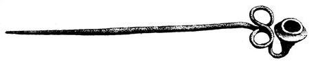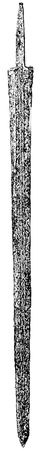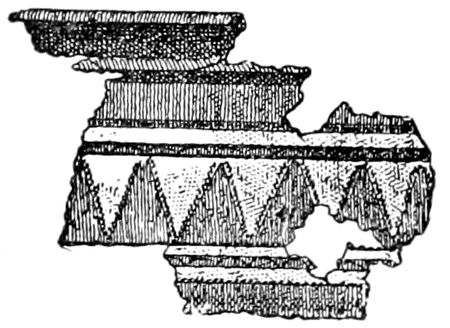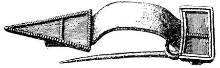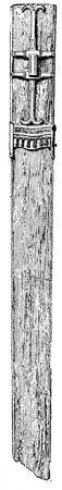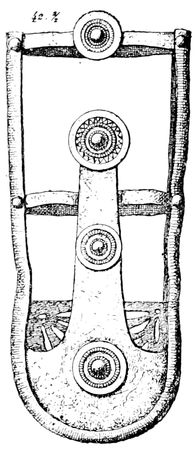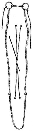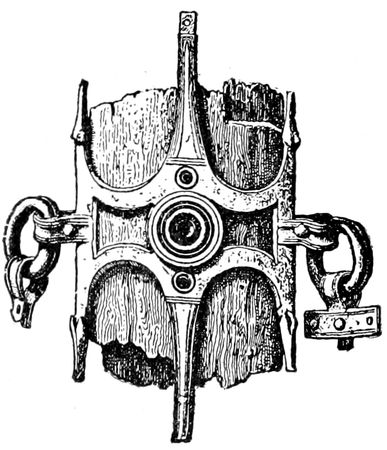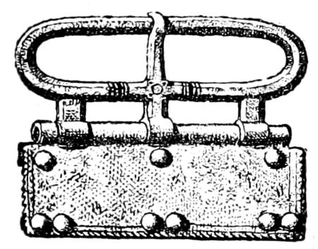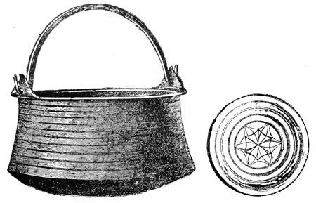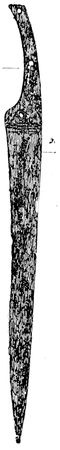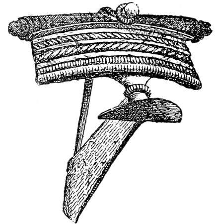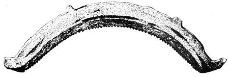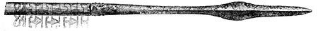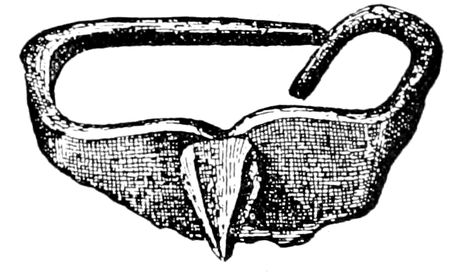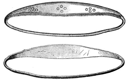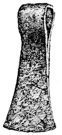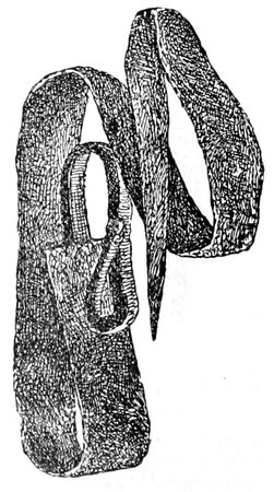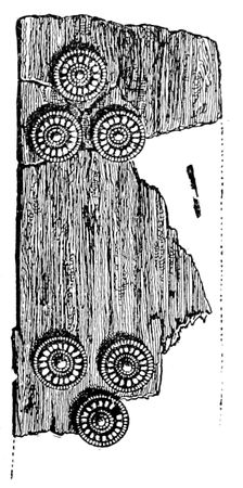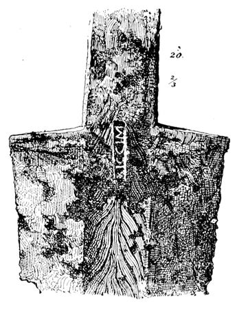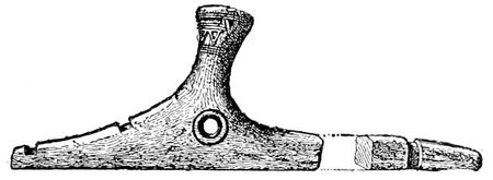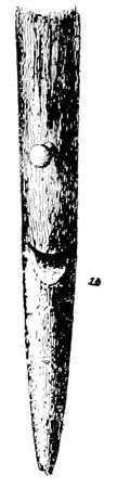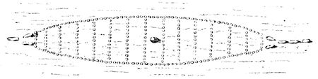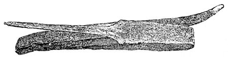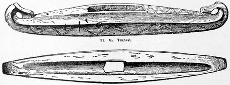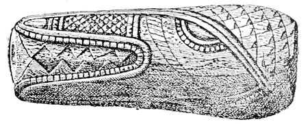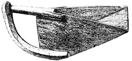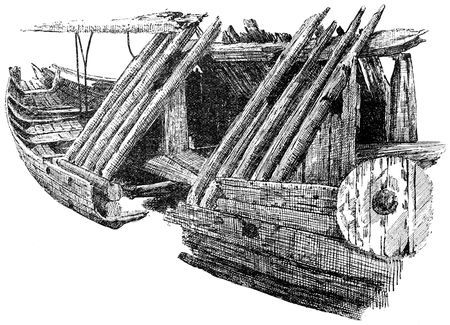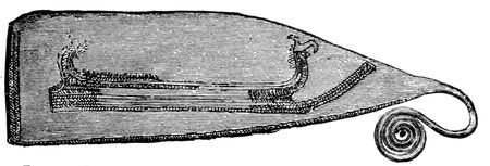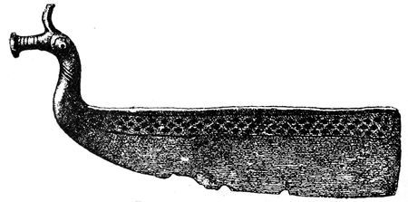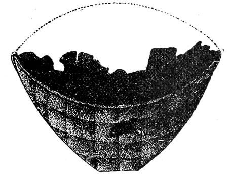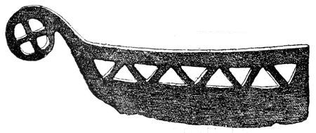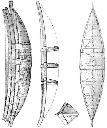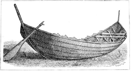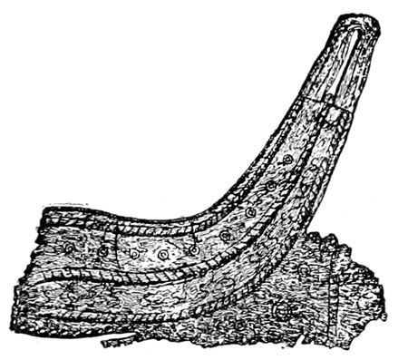 Judging from the number of holes seen, which were about 18 inches below the gunwale, it carried sixteen oars, and was consequently a sixteen-seater. Its preservation is due to the blue clay in which it was partly embedded, the upper part being eaten away owing to the clay being mixed with sand, thus allowing the rain and air to penetrate. It is entirely of oak, clinker built, calked with cows’ hair spun in a sort of cord.