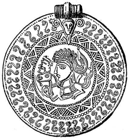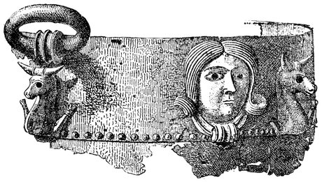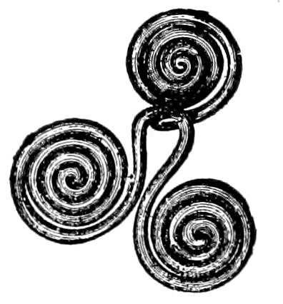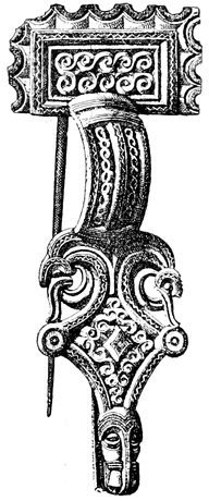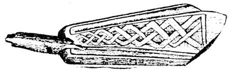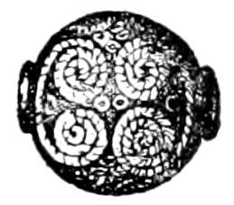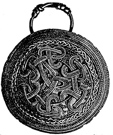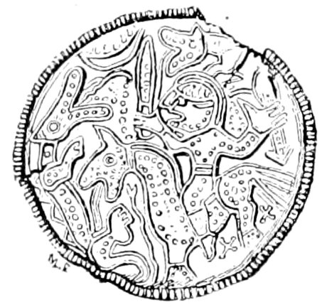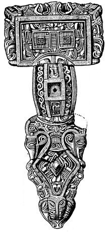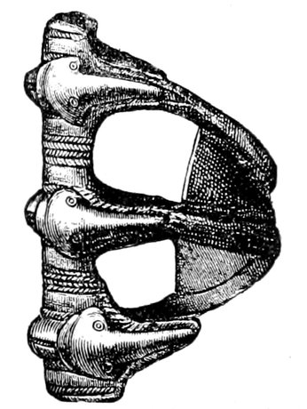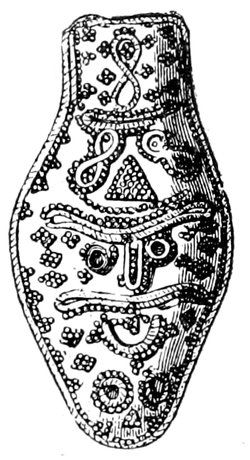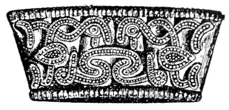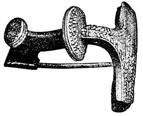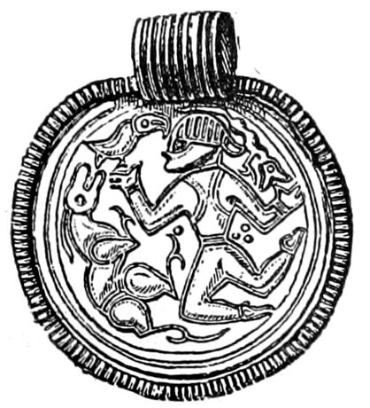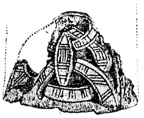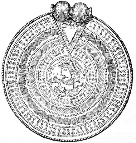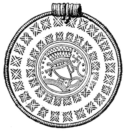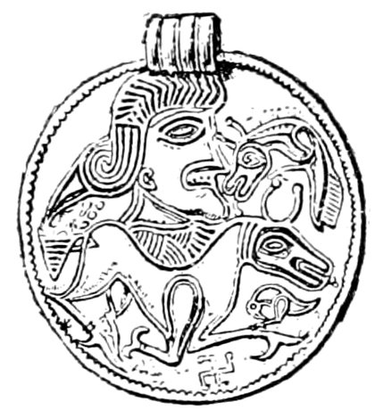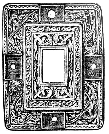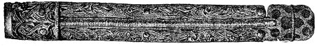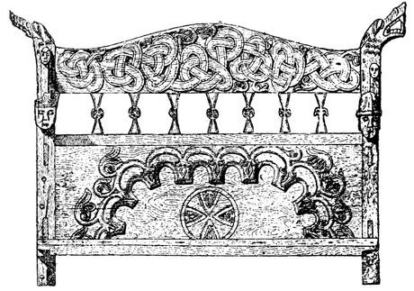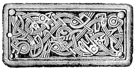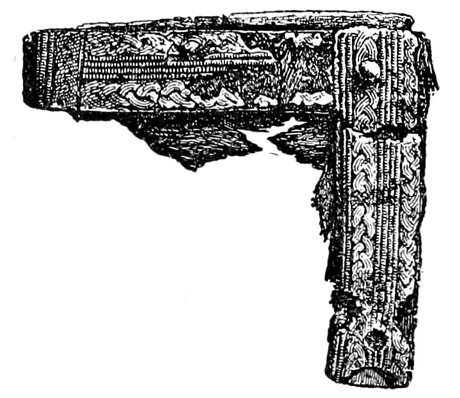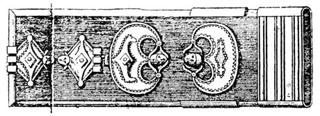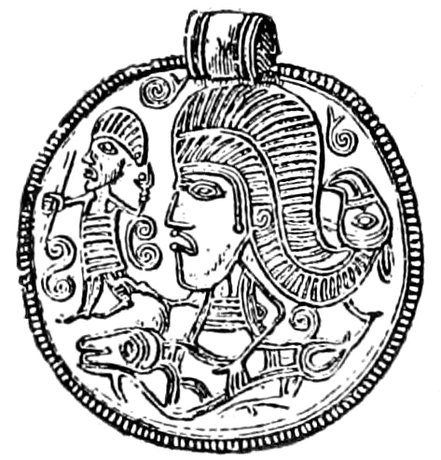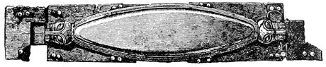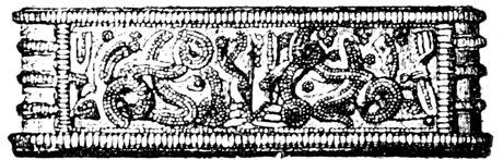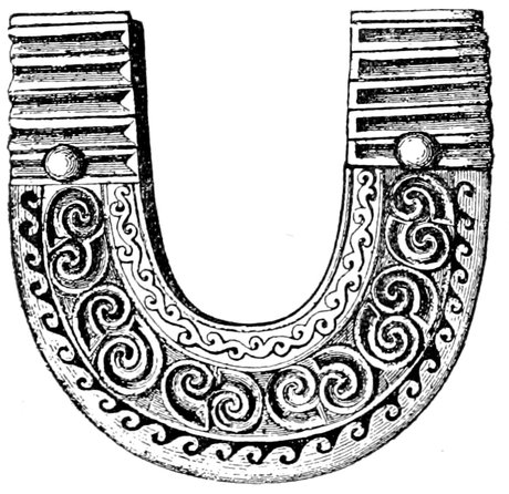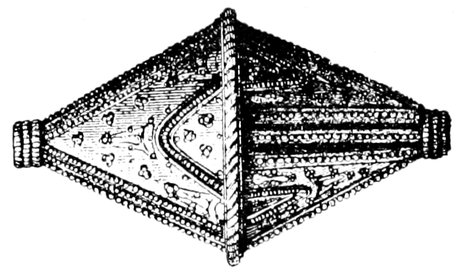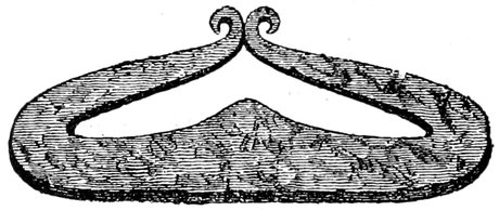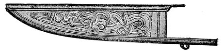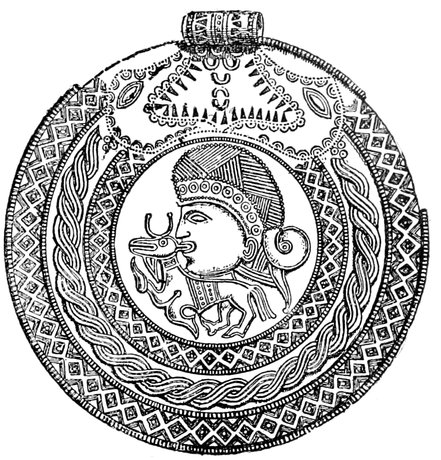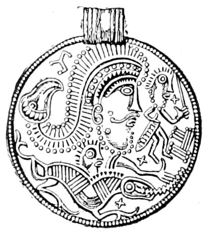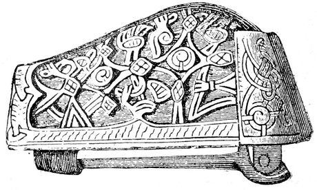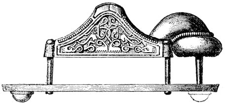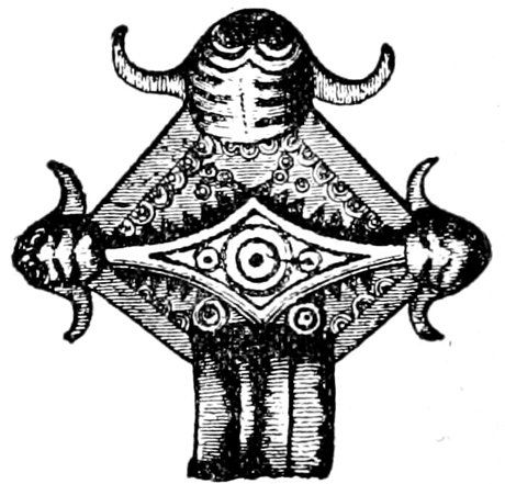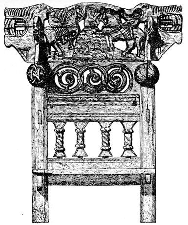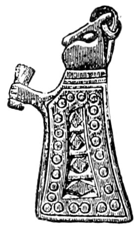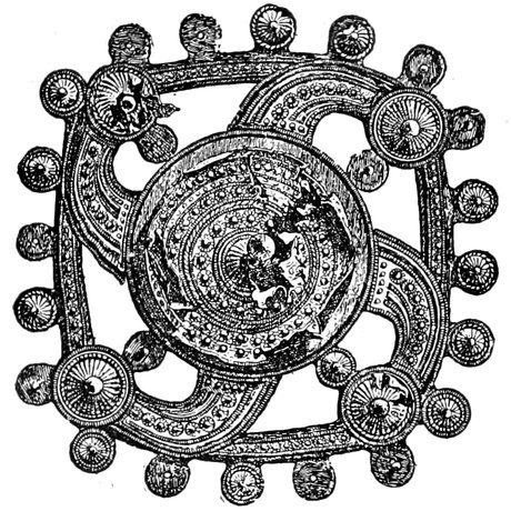 One of two waggons found in the Deibjerg bog, Ringkjobing, West Jutland, ornamented all over with bronze; and on each side representations of two human heads with heavy moustaches, and with the triskele and other mystic signs. Length of sides, 5 feet, 4 inches; straight pole, about 6 feet, including the bent piece; diameter of wheels, 3 feet.