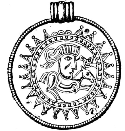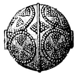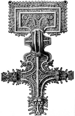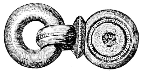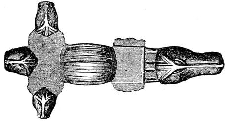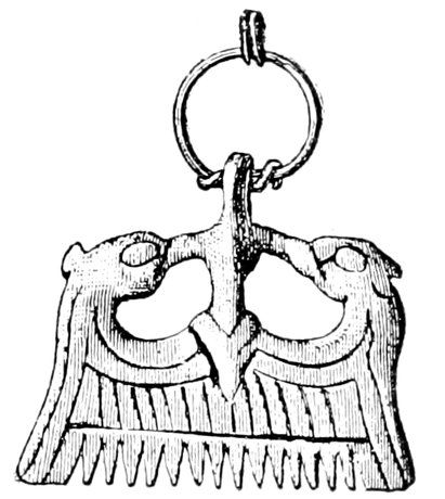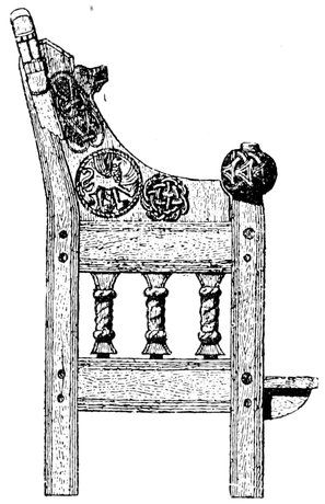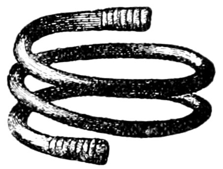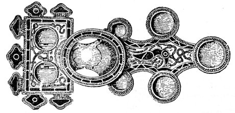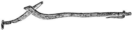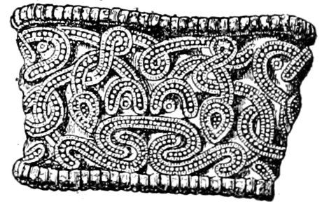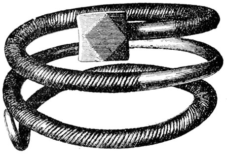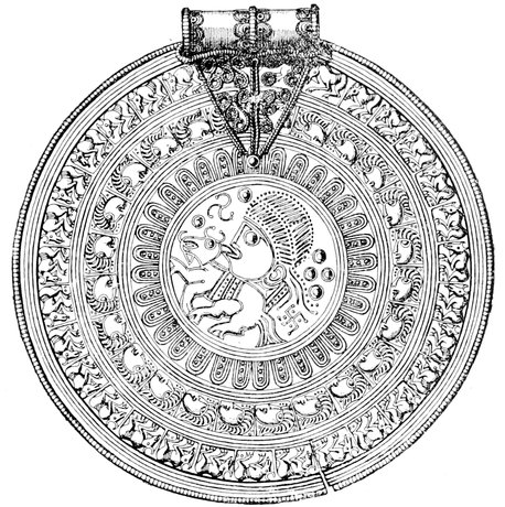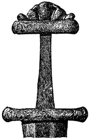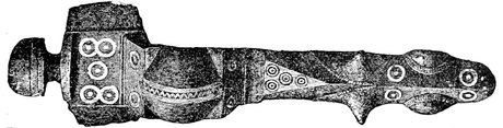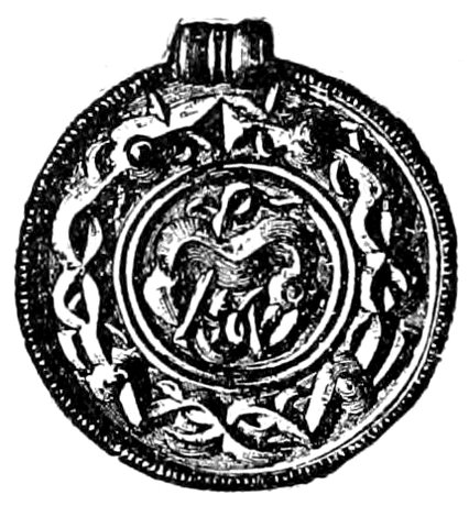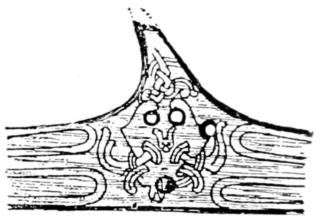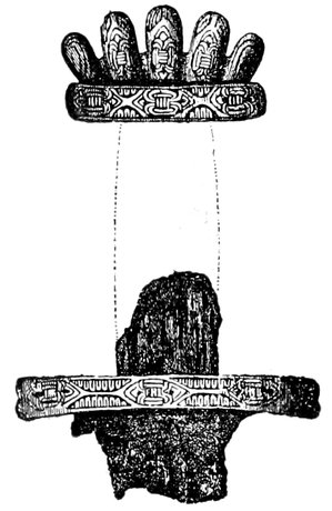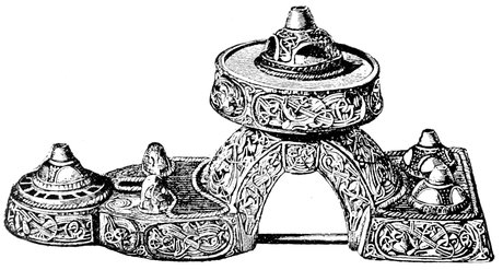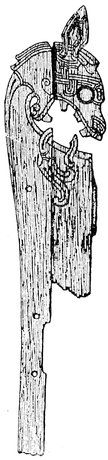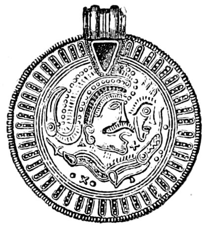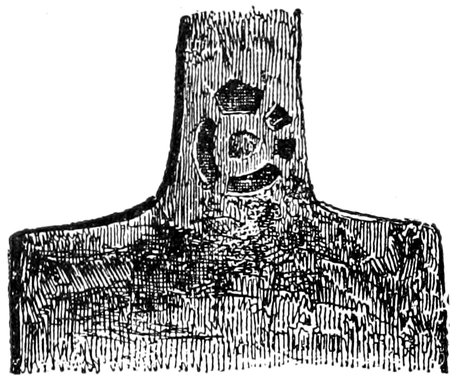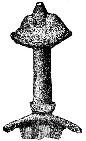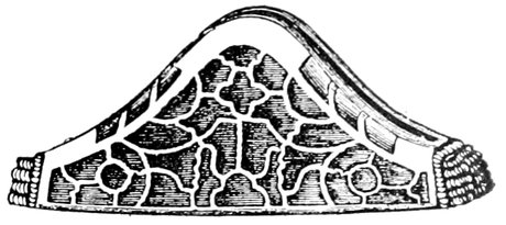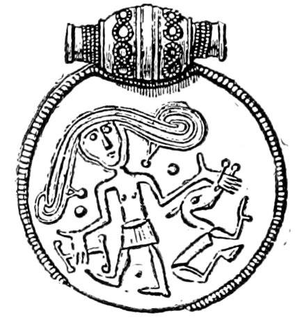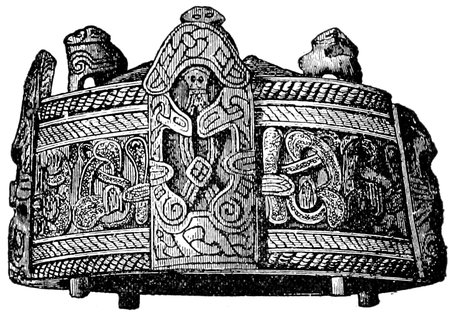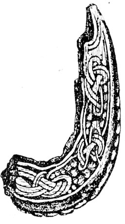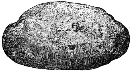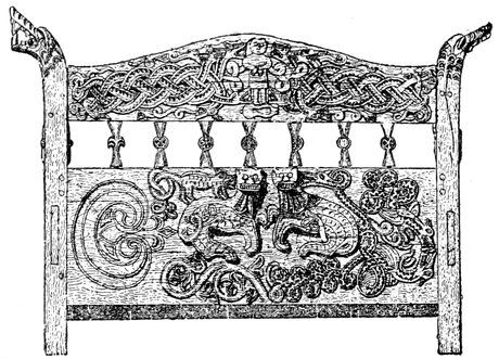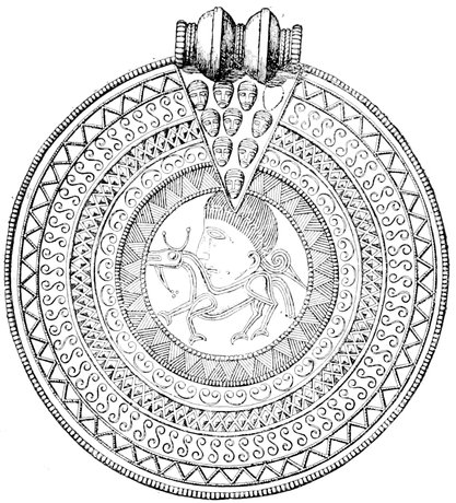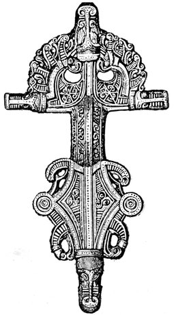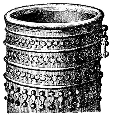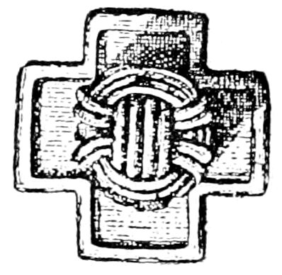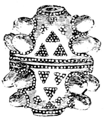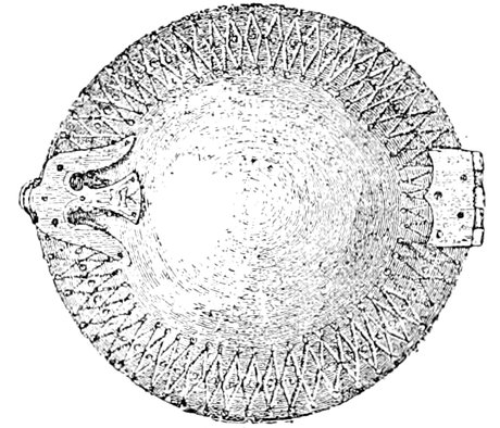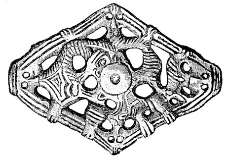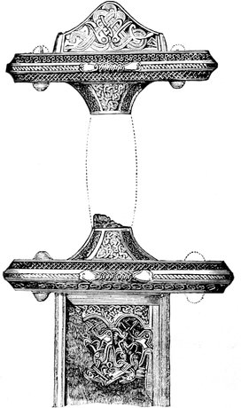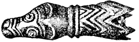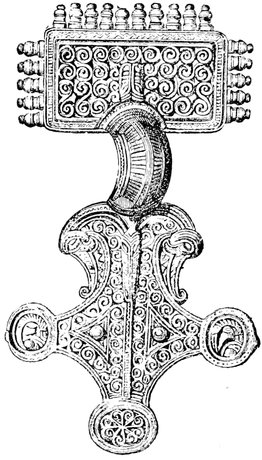 One of two waggons found in the Deibjerg bog, Ringkjobing, West Jutland, ornamented all over with bronze; and on each side representations of two human heads with heavy moustaches, and with the triskele and other mystic signs. Length of sides, 5 feet, 4 inches; straight pole, about 6 feet, including the bent piece; diameter of wheels, 3 feet.