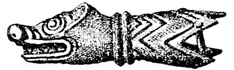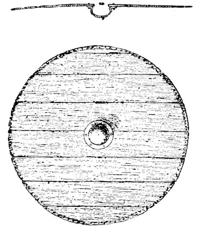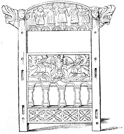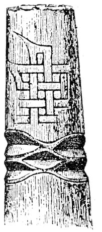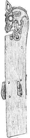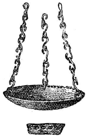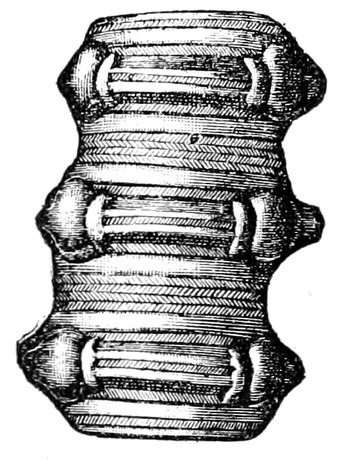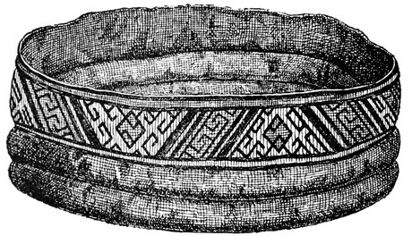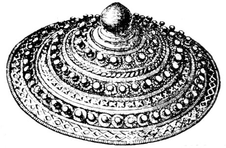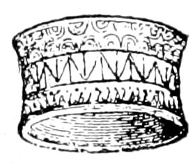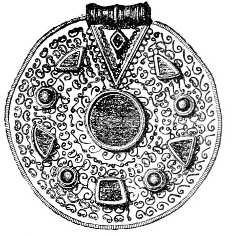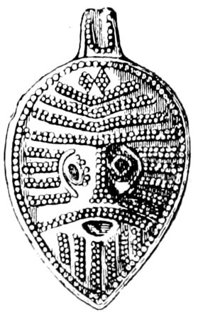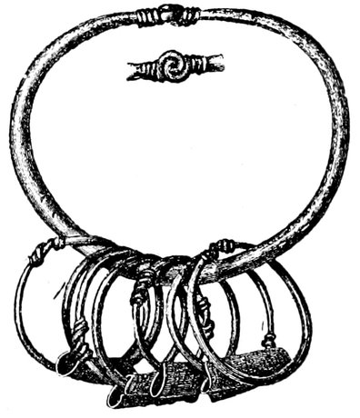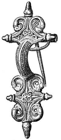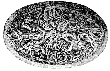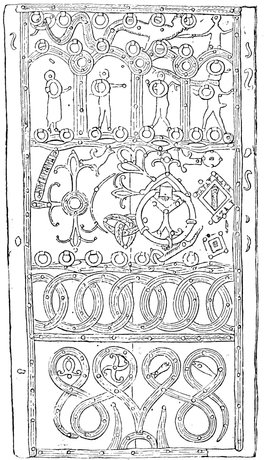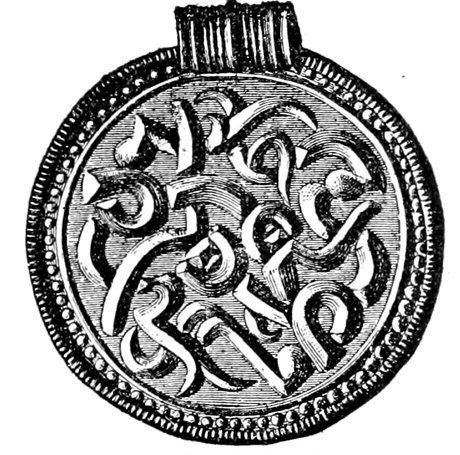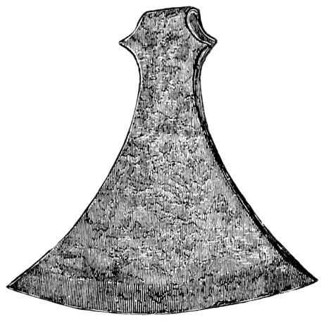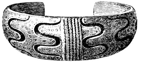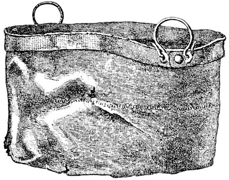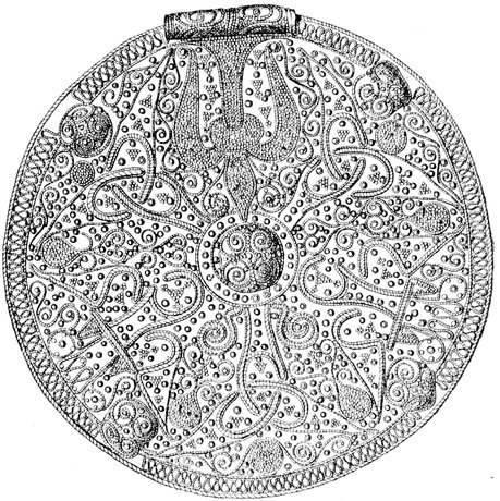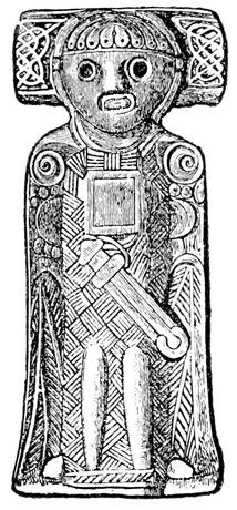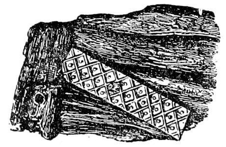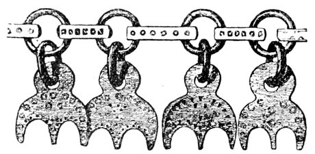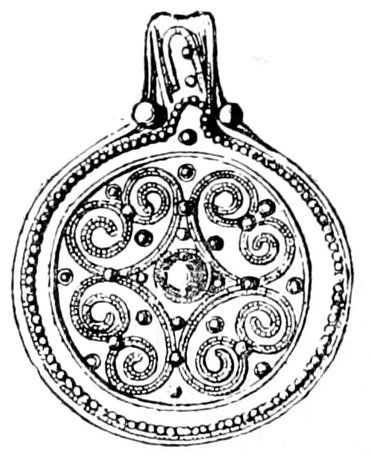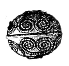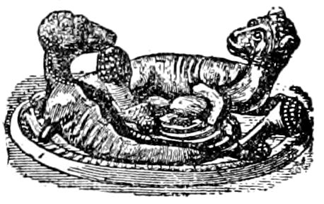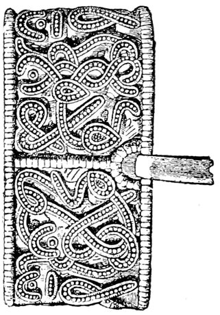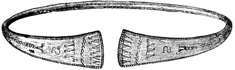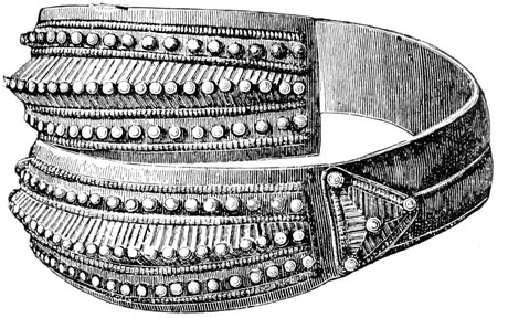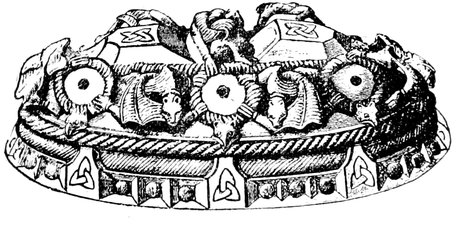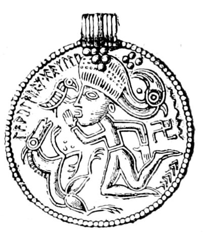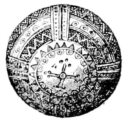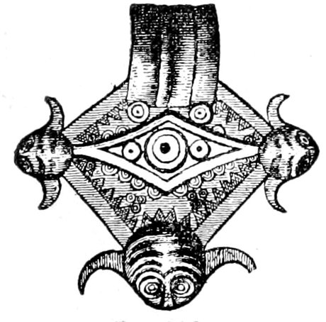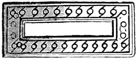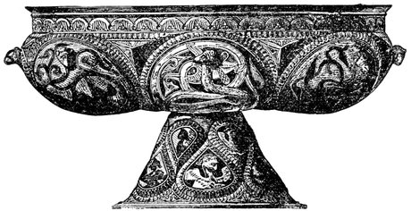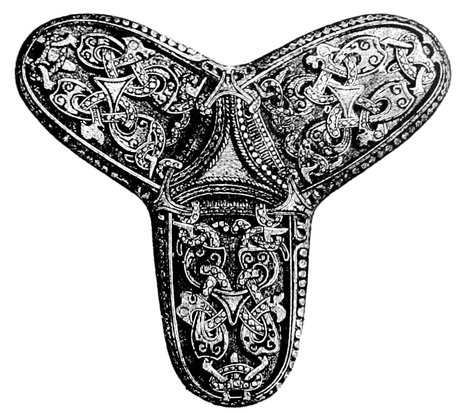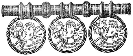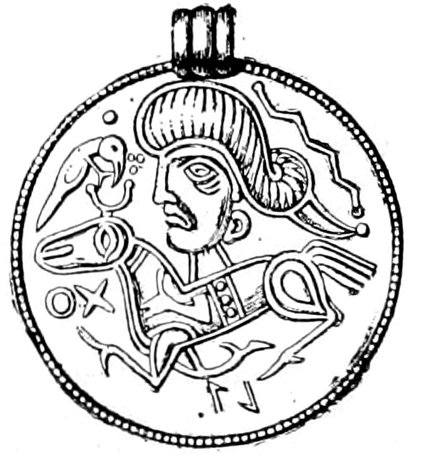 One of two waggons found in the Deibjerg bog, Ringkjobing, West Jutland, ornamented all over with bronze; and on each side representations of two human heads with heavy moustaches, and with the triskele and other mystic signs. Length of sides, 5 feet, 4 inches; straight pole, about 6 feet, including the bent piece; diameter of wheels, 3 feet.