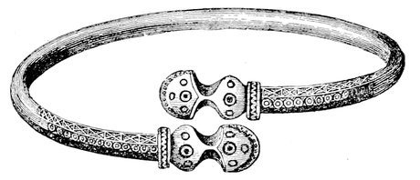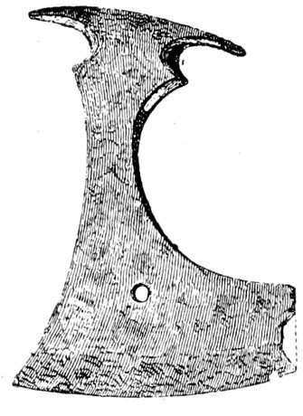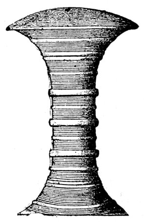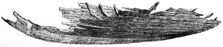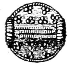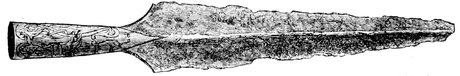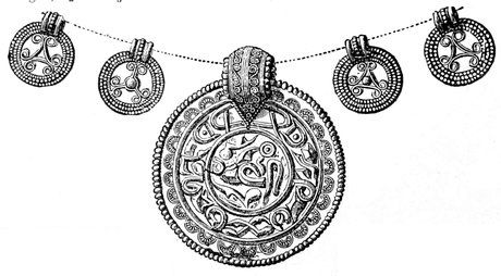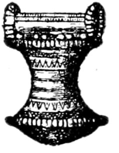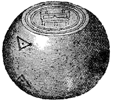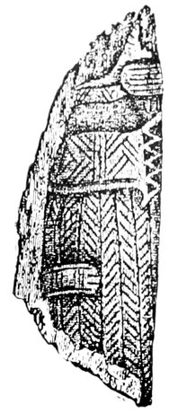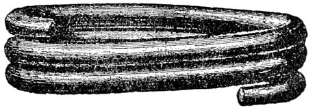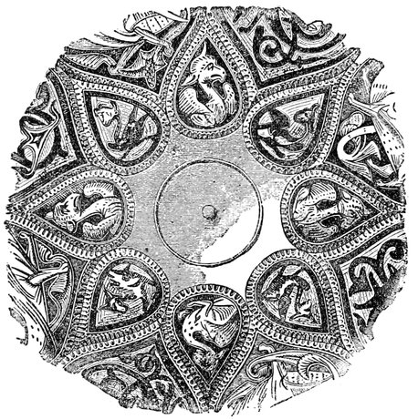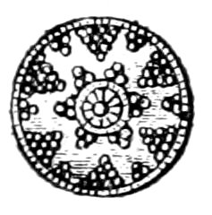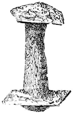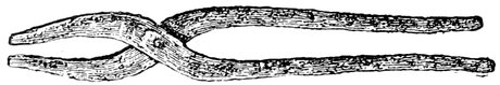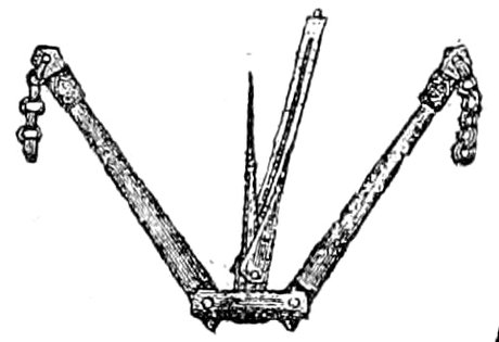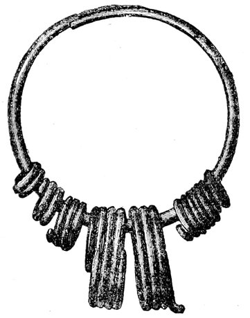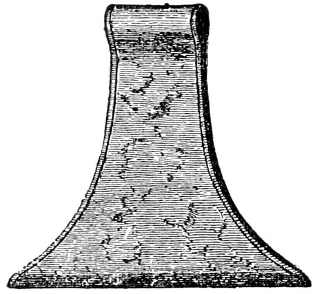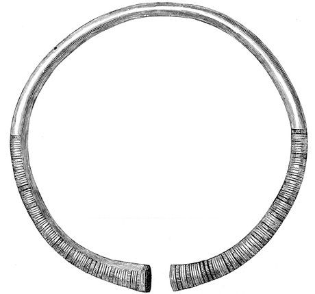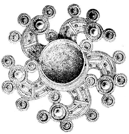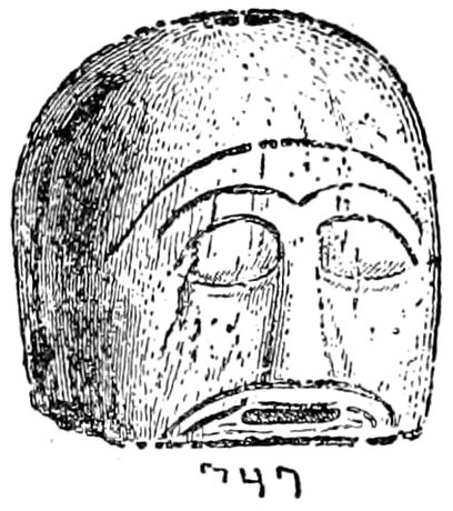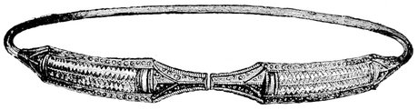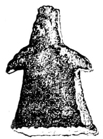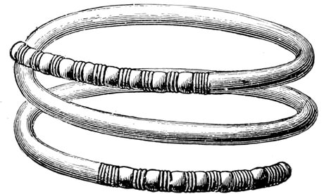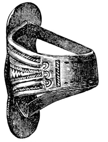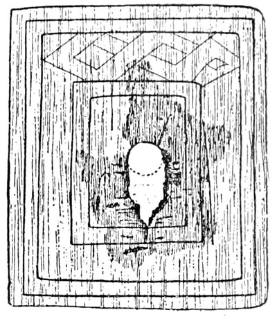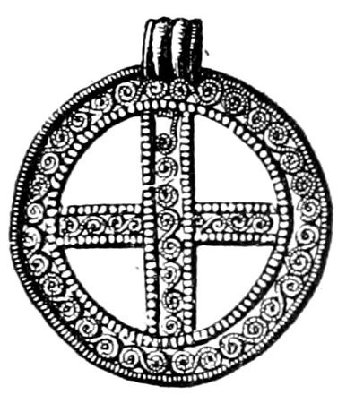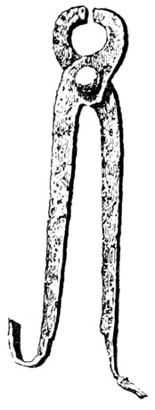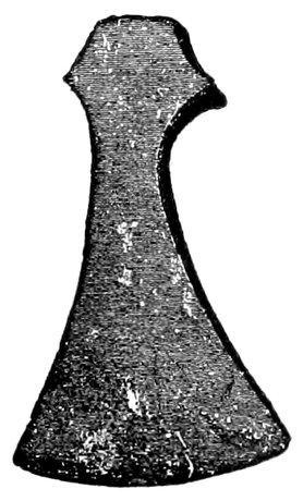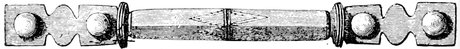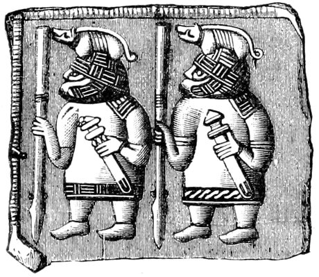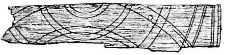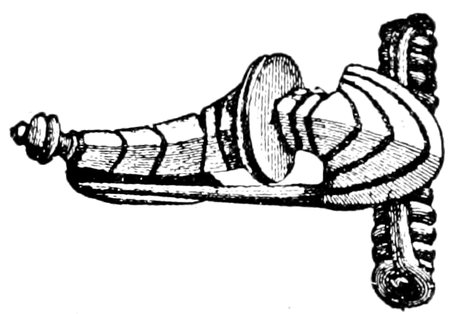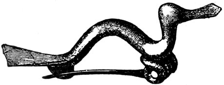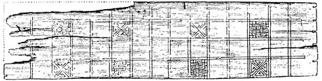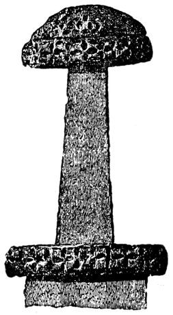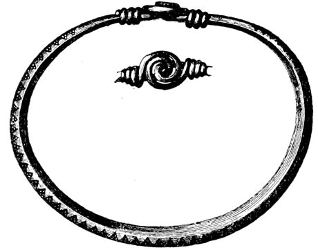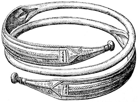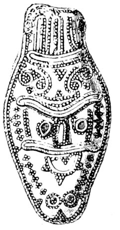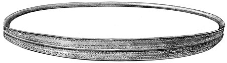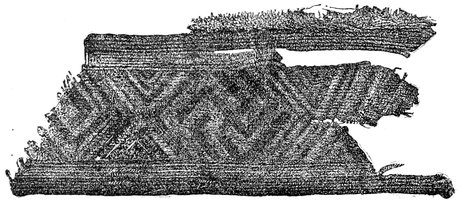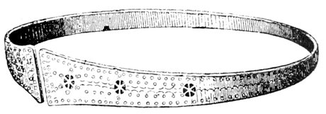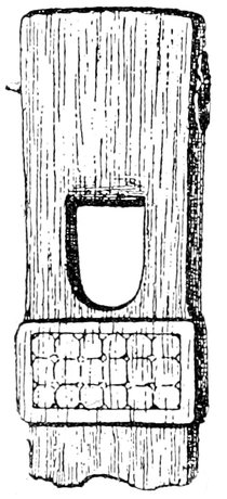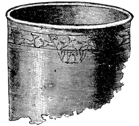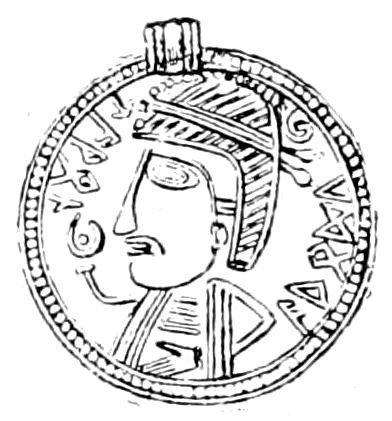 One of two waggons found in the Deibjerg bog, Ringkjobing, West Jutland, ornamented all over with bronze; and on each side representations of two human heads with heavy moustaches, and with the triskele and other mystic signs. Length of sides, 5 feet, 4 inches; straight pole, about 6 feet, including the bent piece; diameter of wheels, 3 feet.