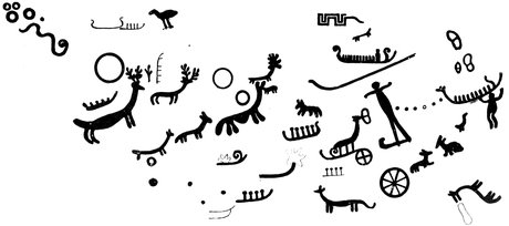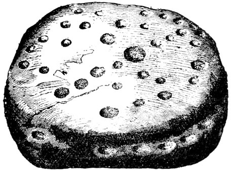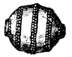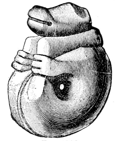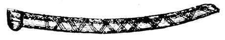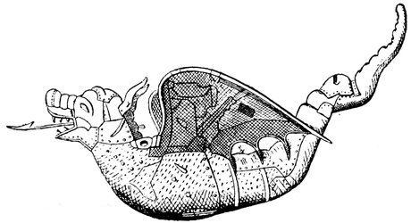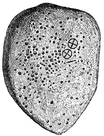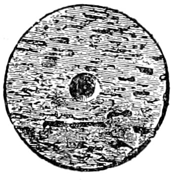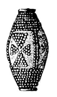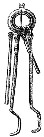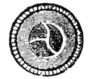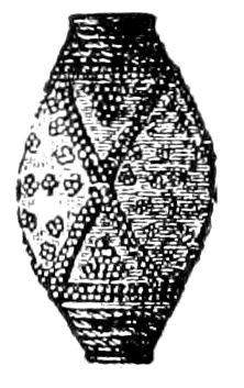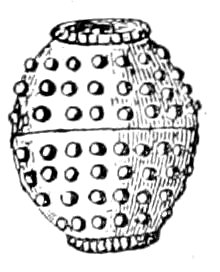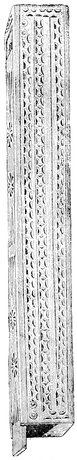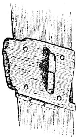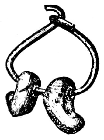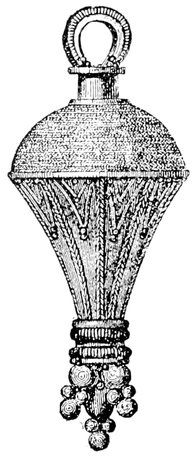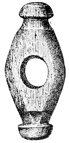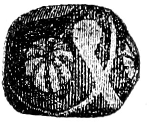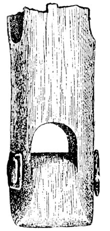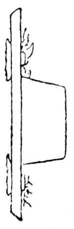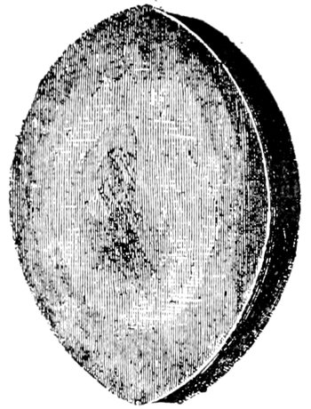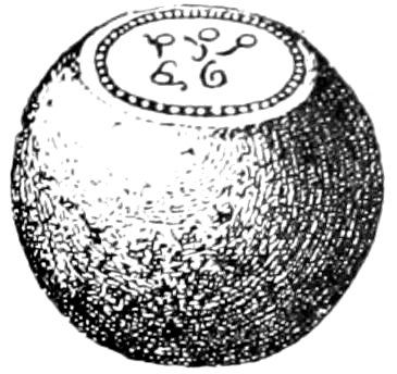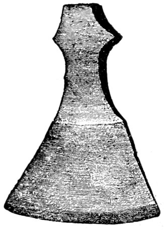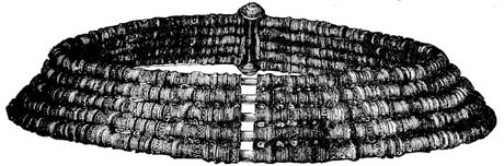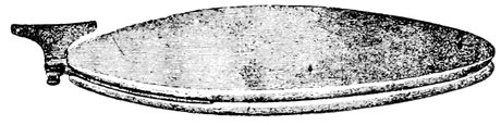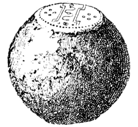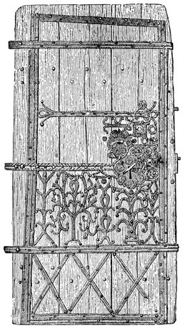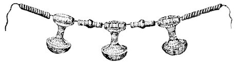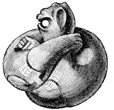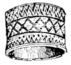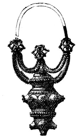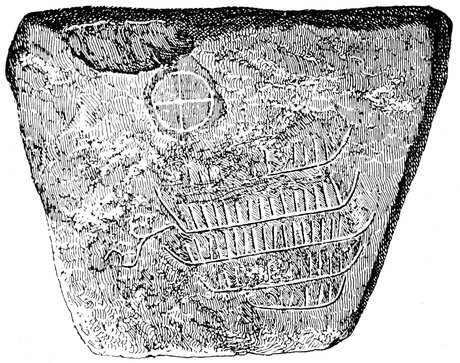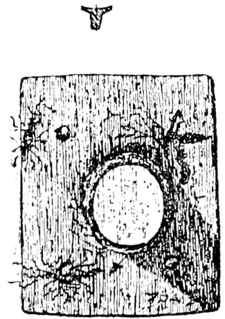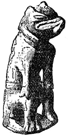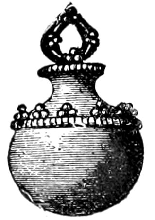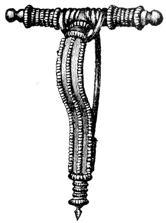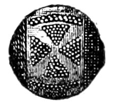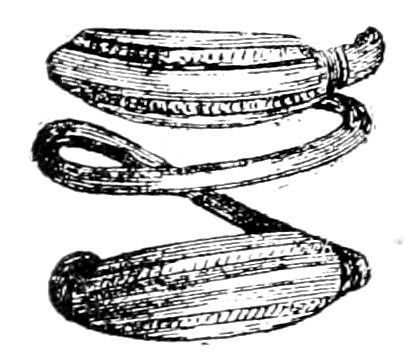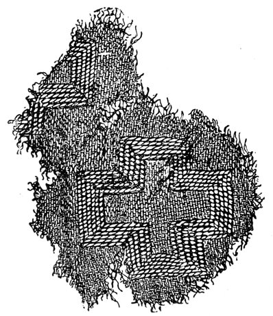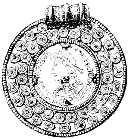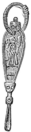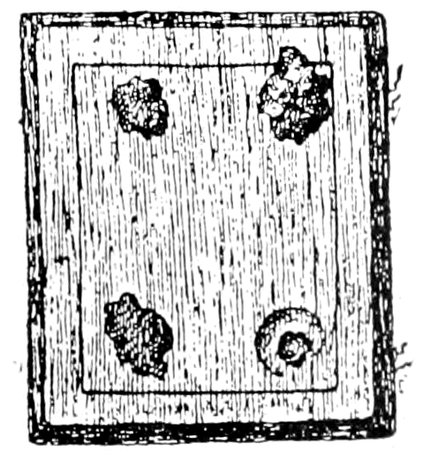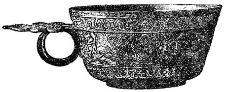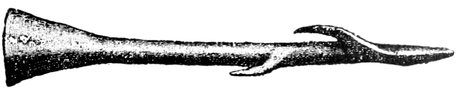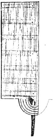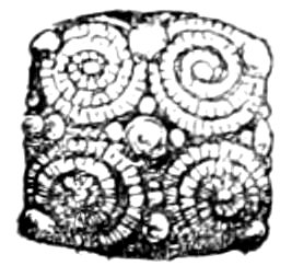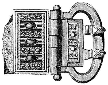 One of two waggons found in the Deibjerg bog, Ringkjobing, West Jutland, ornamented all over with bronze; and on each side representations of two human heads with heavy moustaches, and with the triskele and other mystic signs. Length of sides, 5 feet, 4 inches; straight pole, about 6 feet, including the bent piece; diameter of wheels, 3 feet.