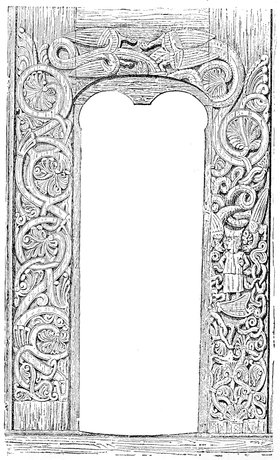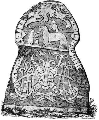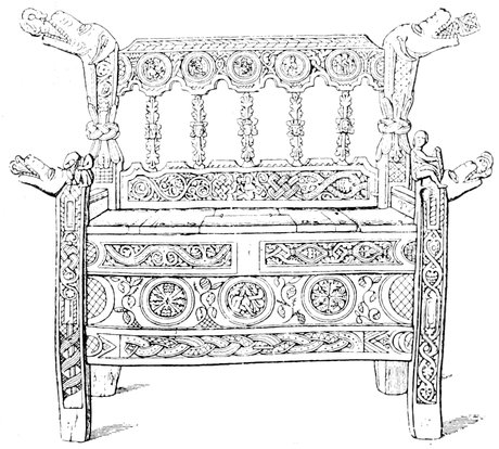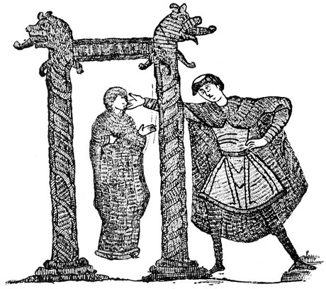 “The kings (Ingibjörg’s brothers) went to a feast at Framnes[4] with Fridthjóf, and, as usual, he treated them all better than they were accustomed to be treated. Ingibjörg was there, and often spoke with Fridthjóf; she said to him: ‘Thou hast a good gold ring.’ ‘That is true,’ said Fridthjóf. Then the kings went home, and their envy against Fridthjóf increased. A little after Fridthjóf became very sad; Björn, his foster-brother, asked why he was so; he said he had it in mind to ask Ingibjörg in marriage; ‘though I have lower 4rank than her brothers, I am as good a man as they.’ Björn said: ‘Let us do it.’ The kings sat on their father’s mound, and Fridthjóf saluted them; afterwards he asked their sister Ingibjörg, Beli’s daughter, in marriage. The kings said: ‘It is very unwise to ask us to give her in marriage to a man of no rank, and we refuse it.’ Fridthjóf said: ‘Then my errand is ended. I will never hereafter give you any help though you may need it” (Fridthjóf’s Saga, c. 2).