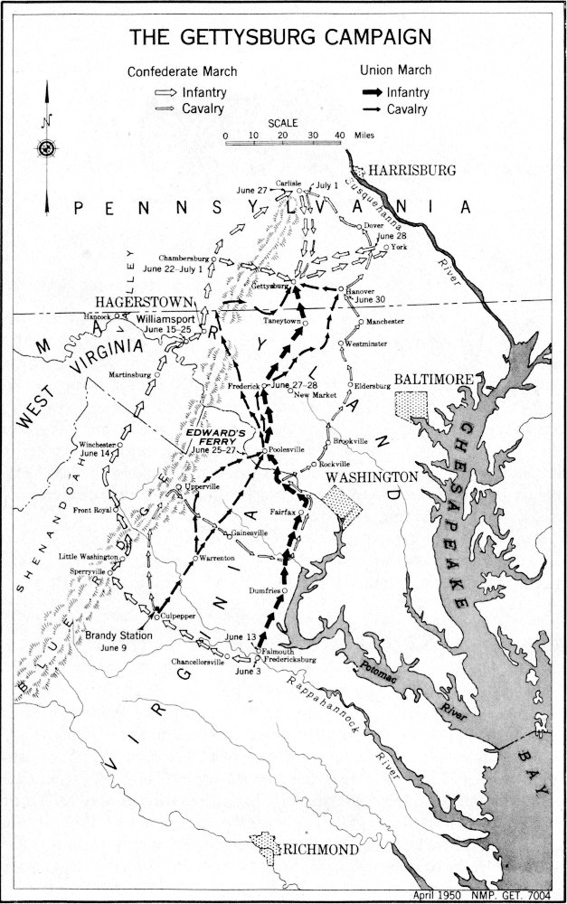 General Stuart, in command of the Confederate cavalry, had obtained conditional approval from Lee to operate against the rear of the Union Army as it marched northward and then to join Lee north of the Potomac. As he passed between Hooker’s army and Washington, the unexpected speed of the Union Army forced Stuart into detours and delays, so that on June 28 he was in eastern Maryland, wholly out of touch with the Confederate force. The eyes and ears of Lee were thus closed at a time when their efficient functioning was badly needed.