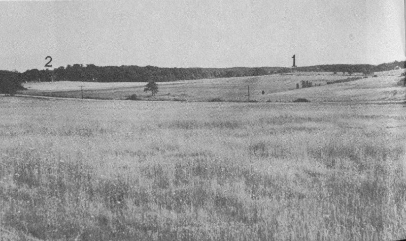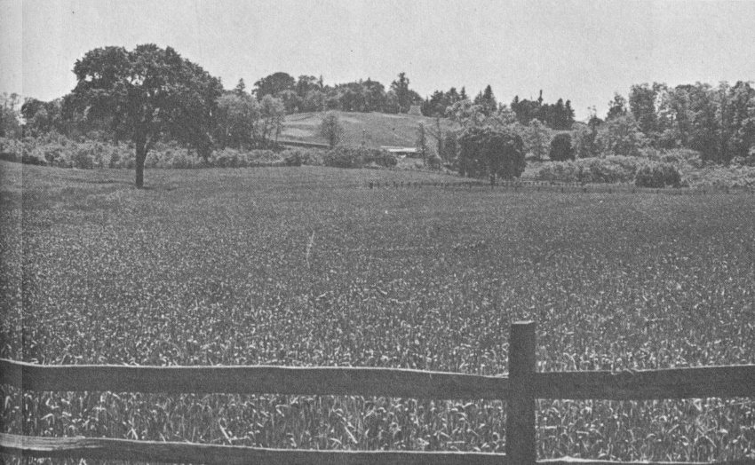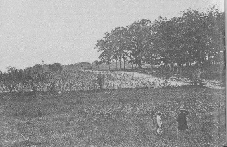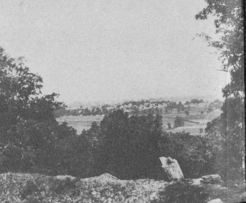 View of Culp’s Hill, taken about 1890, showing earthworks on the crest of the hill. Gettysburg, one-half mile northwest, may be seen through the vista. (Tipton photograph.)