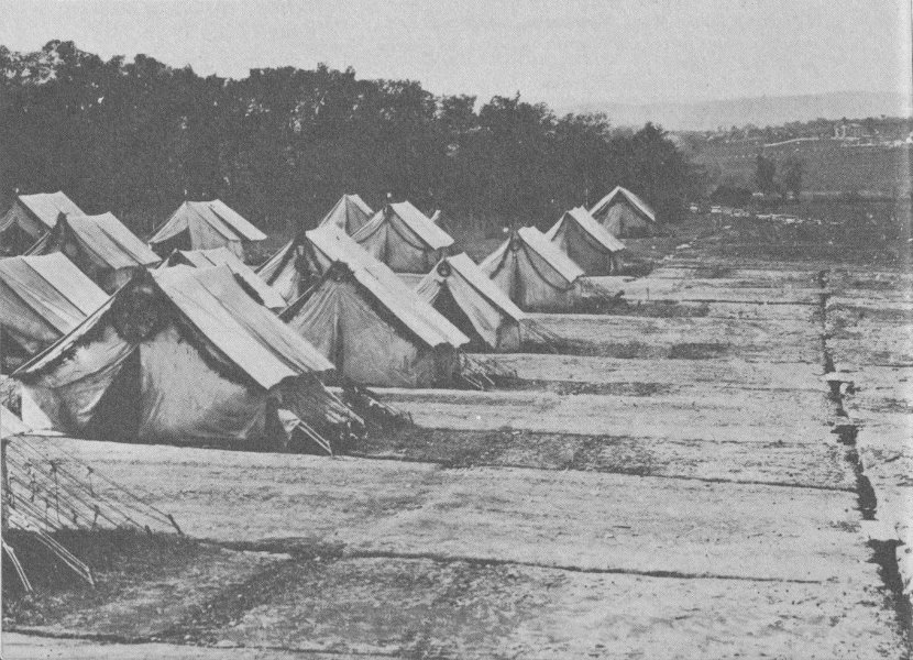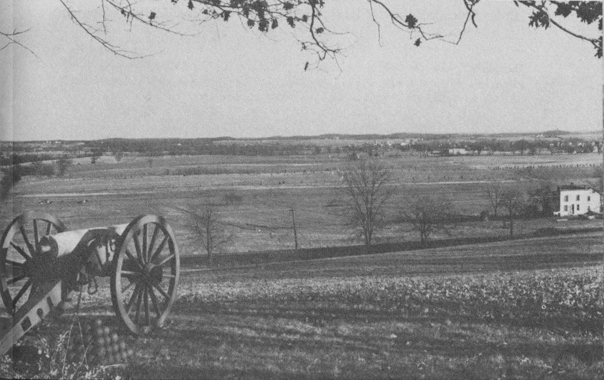 McPherson Ridge and Woods, the Federal position on July 1. In the woods at the right, General Reynolds was killed. The cupola of the Theological Seminary appears in the background. (Brady photograph.)