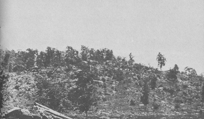 View of Little Round Top taken soon after the battle. The crest and western slope of the hill had been cleared the year preceding the battle. (Brady photograph.)