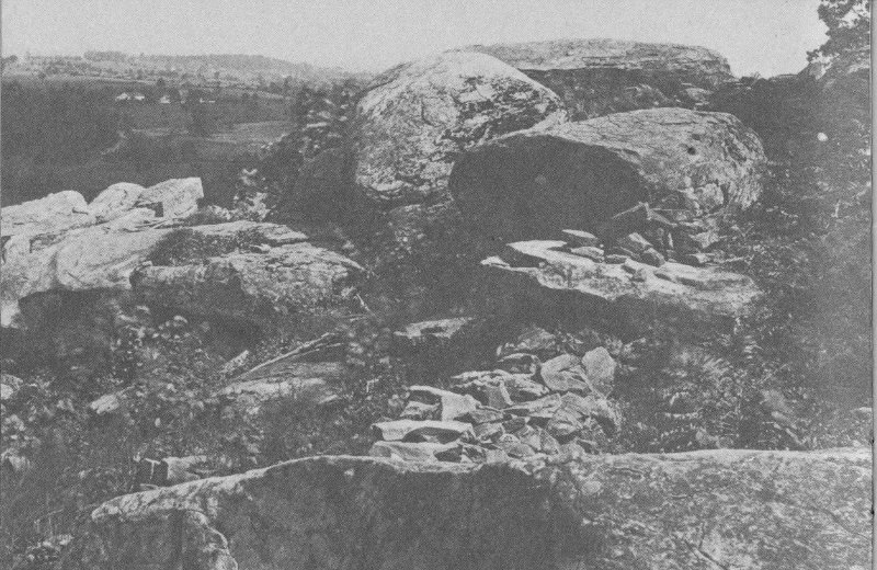 Interior of breastworks on Little Round Top. (Brady photograph.)