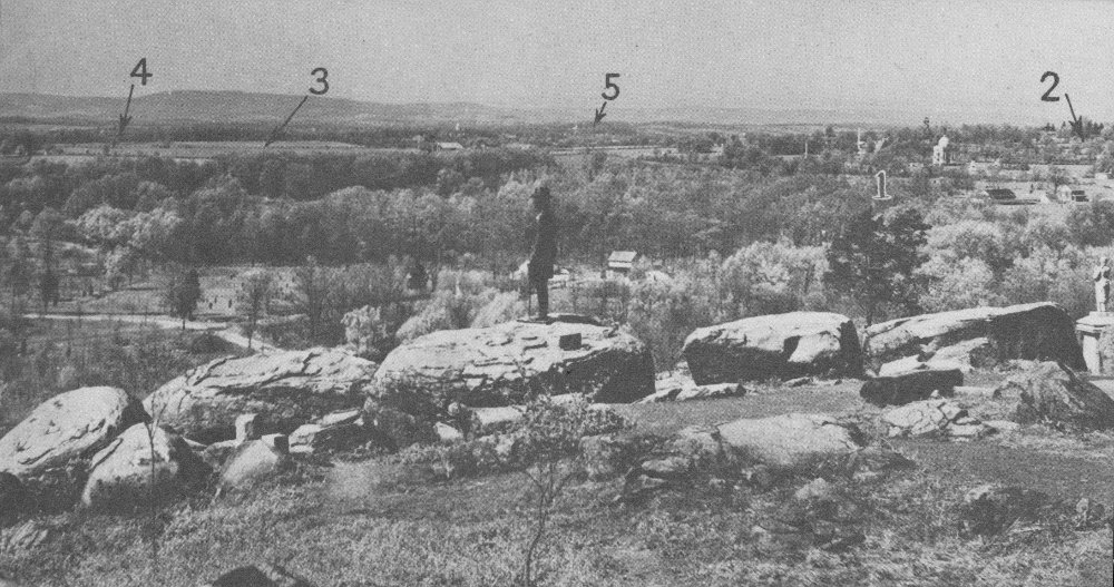 When the Union troops retreated from the battleground north and west of the town on the evening of July 1, they hastily occupied defense positions on Cemetery Hill, Culp’s Hill, and a part of Cemetery Ridge. Upon the arrival of Slocum by the Baltimore Pike and Sickles by way of the Emmitsburg Road, the Union right flank at Culp’s Hill and Spangler’s Spring and the important position at Little Round Top on the left were consolidated. Thus was developed a strong defensive battle line in the shape of a fish hook, about 3 miles long, with the advantage of high ground and of interior lines. Opposite, in a semicircle about 6 miles long, extending down Seminary Ridge and into the streets of 12 Gettysburg, stood the Confederates who, during the night, had closed in from the north and west.