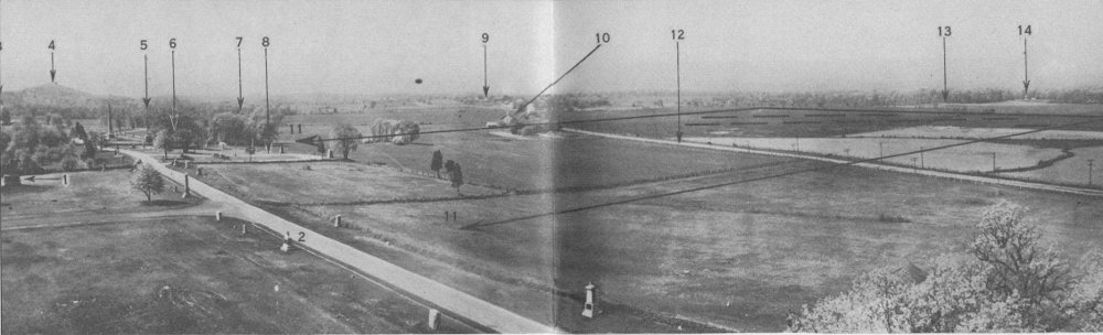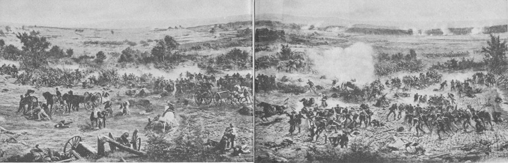 The field of Pickett’s Charge, with his attack on the Union position at The Angle in the foreground. From the Philippoteaux painting in the Gettysburg Cyclorama.