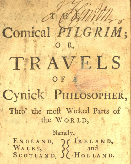 Next, I went a pilgramaging into Devonshire, which might be properly call’d Devilshire, for seeing how the Inhabitants would eat White-Pots red hot in a Manner, a Stranger would be apt to conclude, they came from whence they have nothing else for their Food but Brimstone and Fire. Hereupon, I galloped strait into Cornwal, a County very plentiful of Wood-Cocks, not only flying in the Air, but you should also see them smoaking or tipling in every Chimney-Corner, in Winter. Thence, I rambled into Somersetshire, where, at the Bath, I saw so much Whoredom committed, that I thought the Men, or Women neither had Occasion to wash themselves in hot Water, when their Bodies were all on Fire before; unless it was to make an Experiment of that Aphorism in Physick, which says, one Heat drives out another. Not liking this Place, I took a Pilgrimage (I can’t say Tour, or Progress, because Pilgrims are not Noblemen) into Gloucestershire, where I saw the Sins of the People were as red as the Scarlet they die; so I soon shook the Dust off my Shoes, as a Testimony against their Wickedness, and went to Oxon.