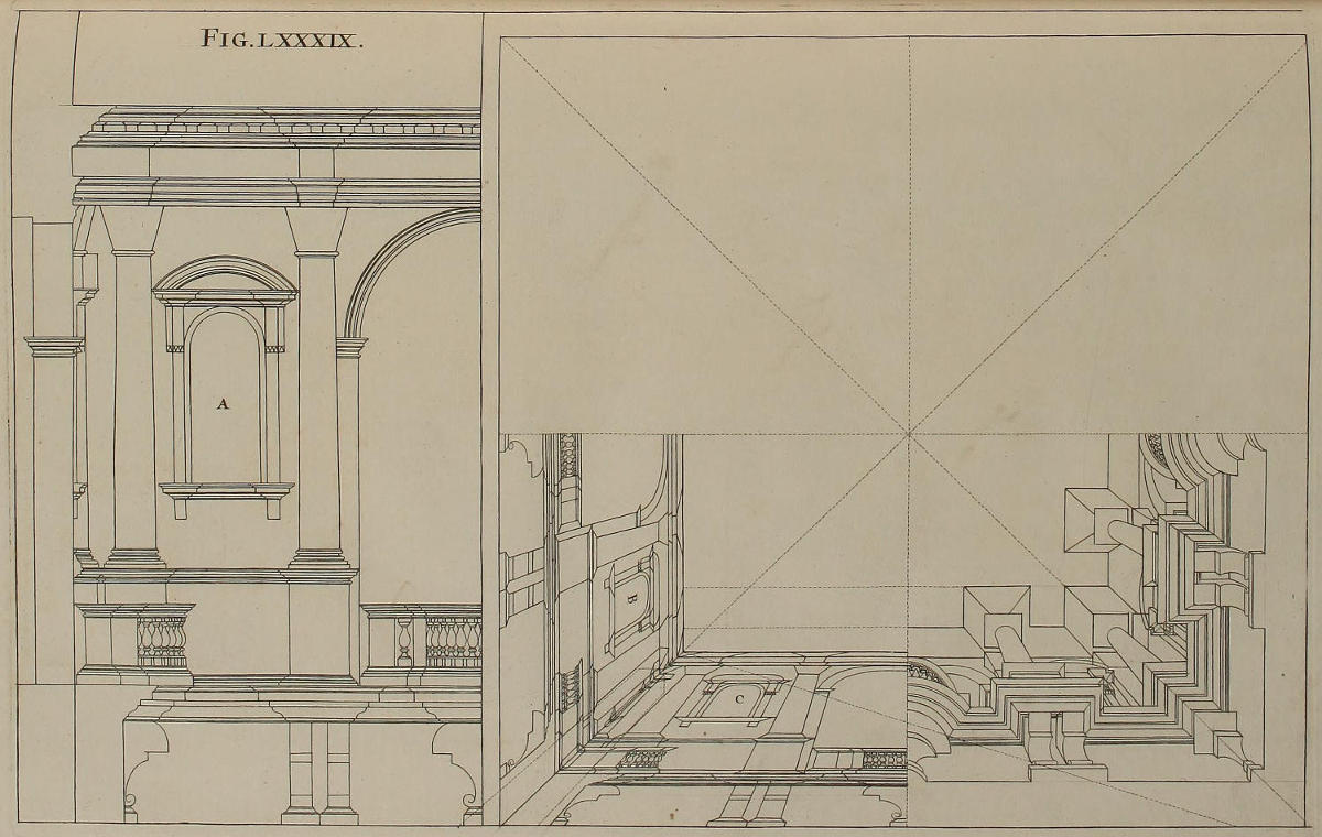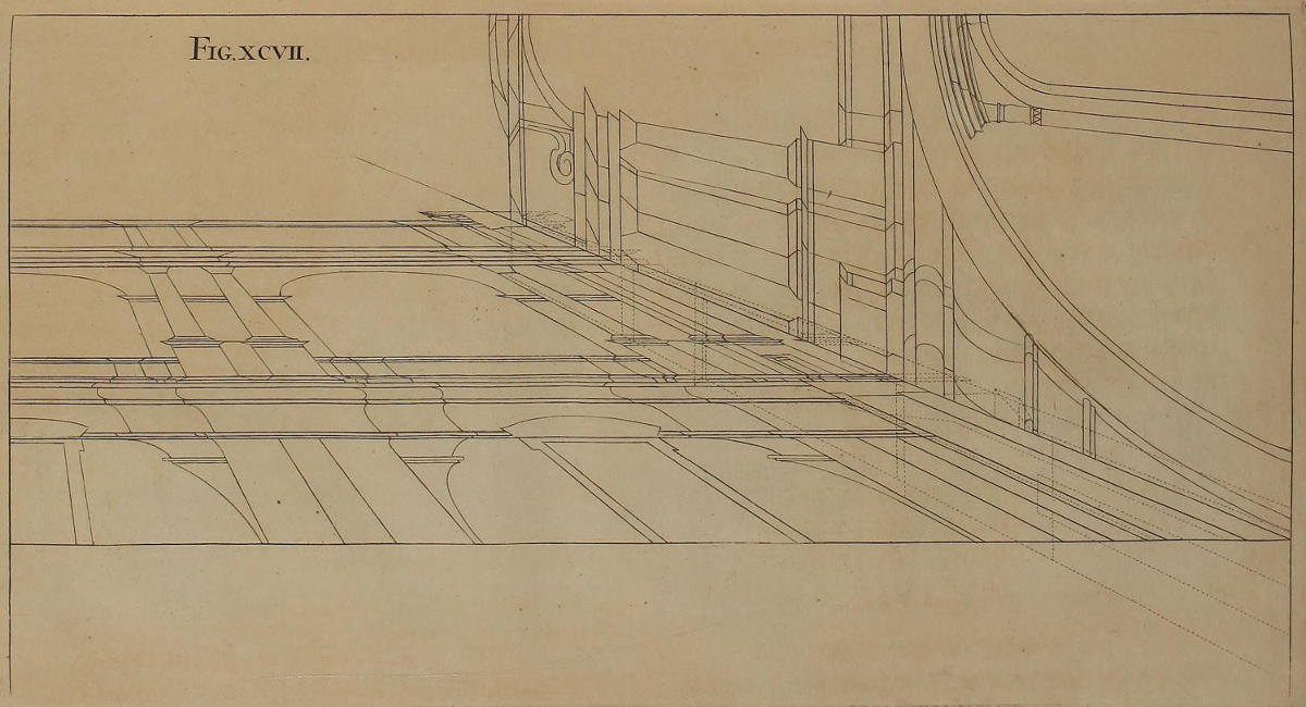 III. That from the Disposition of the Perspective-Plans and Uprights, with respect to the finish’d Pieces in the Twelfth and many following Figures, you would observe, with what Dispatch the said Pieces may, without the Help of Compasses, be delineated by your Drawing-Square; viz. the Perpendiculars from the Perspective-Plan, and the level Lines from the Perspective-Upright, or Section.