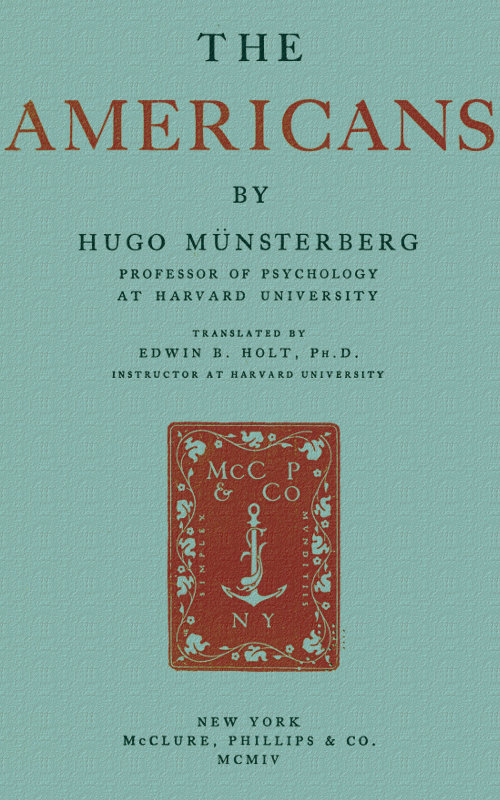viiiWhen I was urged, on so many sides, to bring my “Americans” before the Americans, it was, therefore, clear to me from the outset that I ought not to do it myself under any circumstances. If I had translated the book myself, it would have become simply an English book, written in English by the author; and yet its only possible right to existence must lie in its reflected character, in its having been written for others, in its coming back to the New World from the Old. My friend, Dr. Holt, who has been for years my assistant in the Harvard Psychological Laboratory, has assisted, therefore, in this social psychological experiment, and translated the book from the German edition.