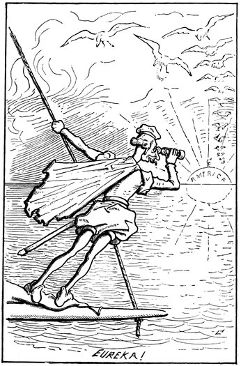 Lifting our eyes skyward we see the American eagle soaring forth to meet the great discoverer, with outstretched pinions, and bringing his whole family with him. We confess that we, for one, cannot gaze upon this scene without envying Mr. Columbus the luxury of his emotions and wishing we knew where there was a new world lying around loose that we might go right off and discover it.