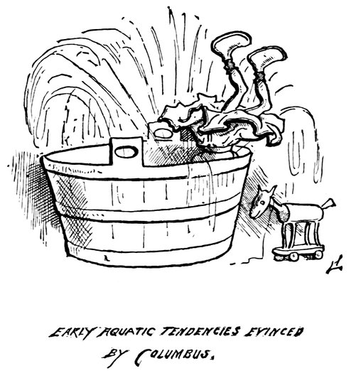 21Our hero took to the water naturally very early in life. Let the youth of America remember this. Let the youth of every land who contemplate discovering new worlds remember that strong drink is fatal to the discovery business; for it is our candid opinion, that, had Christopher Columbus taken to, say strong coffee in his very earliest infancy, the chances are that America would never have had a Centennial, and these pages had never been written. Two circumstances which the stoutest heart among us cannot for a moment contemplate without a shudder.