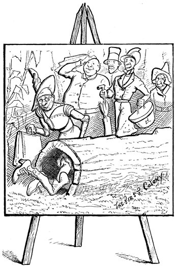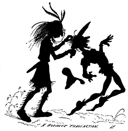 He went into the lecture field, holding forth to large and fashionable audiences, composed of intelligent savages, upon the science of navigation, illustrating his lecture with an old mariner’s compass that indicated all four of the cardinal points at once, and a superannuated bulls-eye watch that 36would do nothing but tick. These simple-minded children of nature listened with attentive ears, and looked on with wondering eyes, and came down largely with green corn, sardines, silk hats, hard boiled eggs, fall overcoats, pickled oysters, red handkerchiefs, ice cream, dried herring, kid gloves, pickled tripe, and other Indian luxuries, which proved invaluable to the starving, threadbare colonists. Thus it is seen that Mr. Smith obtained on tick[2] what he had no cash to pay for.