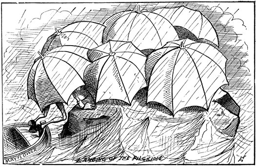 Thinking wild savages least likely to entertain pronounced religious prejudices, the captain of the May Flour bethought 46him of America, and landed them hap-hazard at Plymouth, Massachusetts, on the 21st of December, 1620. The Pilgrims made themselves as comfortable on Plymouth Rock as possible, and formed a treaty with the Indians which lasted several days.