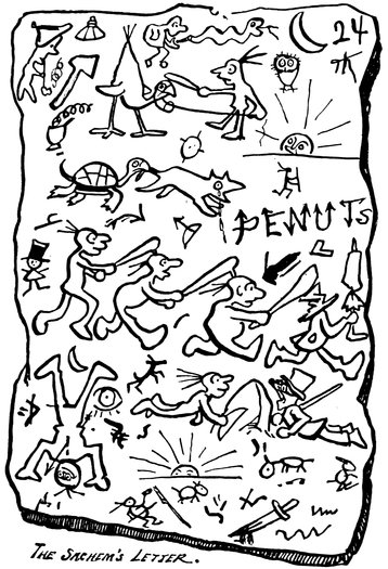 The accompanying sketch not only accurately illustrates the event just narrated, but gives us a faithful and striking portrait of each of the Pilgrim Fathers, which will be immediately recognized by all their acquaintances. The drawing is made from a photograph taken on the spot by an artistic Pilgrim, who brought his camera with him, hoping to turn a penny by photographing the natives. We may here incidentally remark that his first native “subject,” dissatisfied with the result of a “sitting,” scalped the artist and confiscated 47his camera, which he converted into a rude sort of accordion. This instrument was the cause in a remote way of the ingenious native’s death, for he was promptly assassinated by his indignant neighbors. Let the young man over the way, who has recently traded his mother’s flat-irons for a concertina, take warning.