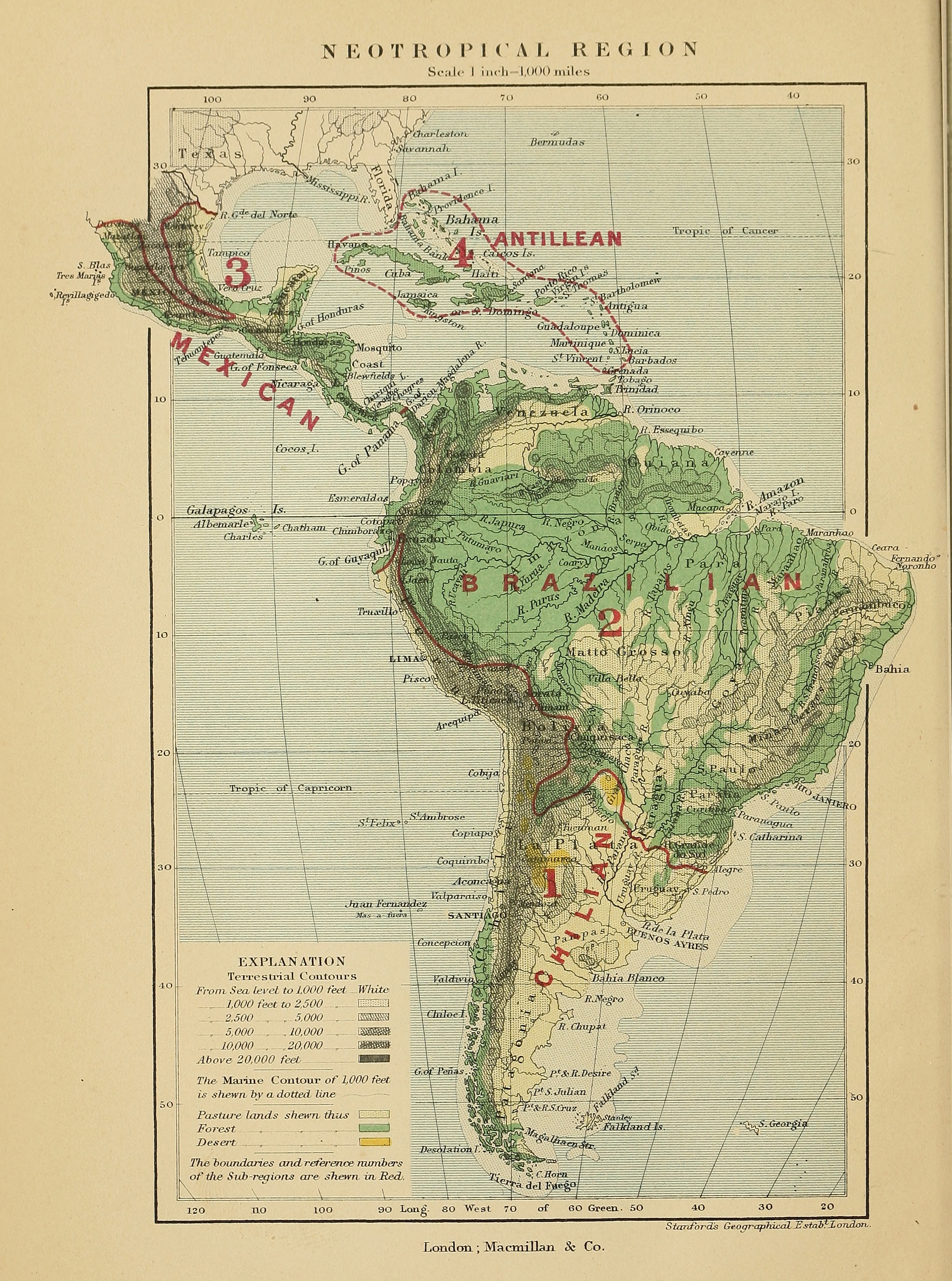 Together with this variety and richness, there is a remarkable uniformity of animal life over all the tropical continental portions of the region, so that its division into sub-regions is a matter of some difficulty. There is, however, no doubt about separating the West Indian islands as forming a well-marked subdivision; characterised, not only by that poverty of forms which is a general feature of ancient insular groups, but also by a number of peculiar generic types, some of which are quite foreign to the remainder of the region. We must exclude, however, the islands of Trinidad, Tobago, and a few other small islands near the coast, which zoologically form a part of the main land. Again, the South Temperate portion of the continent, together with the high plateaus of the Andes to near the equator, form a well-marked subdivision, characterised by a peculiar fauna, very distinct both positively and negatively from that of the tropical lowland districts. The rest of Tropical South America is so homogeneous in its forms of life that it cannot be conveniently subdivided for the purposes of a work like the present. There are, no doubt, considerable differences in various parts of its vast area, due partly to its having been once separated into three or more islands, in part to existing diversities of physical conditions; and more exact knowledge may enable us to form several provinces or perhaps additional sub-regions. A large proportion of the genera, however, when sufficiently numerous in species, range over almost the whole extent of this sub-region wherever the conditions are favourable. Even the Andes do not seem to form such a barrier as has been supposed. North of the equator, where its western slopes are moist and forest-clad, most of the genera are found on both sides. To the south of this line its western valleys are arid and its lower plains almost deserts; and thus the absence of a {5}number of groups to which verdant forests are essential, can be traced to the unsuitable conditions rather than to the existence of the mountain barrier. All Tropical South America, therefore, is here considered to form but one sub-region.