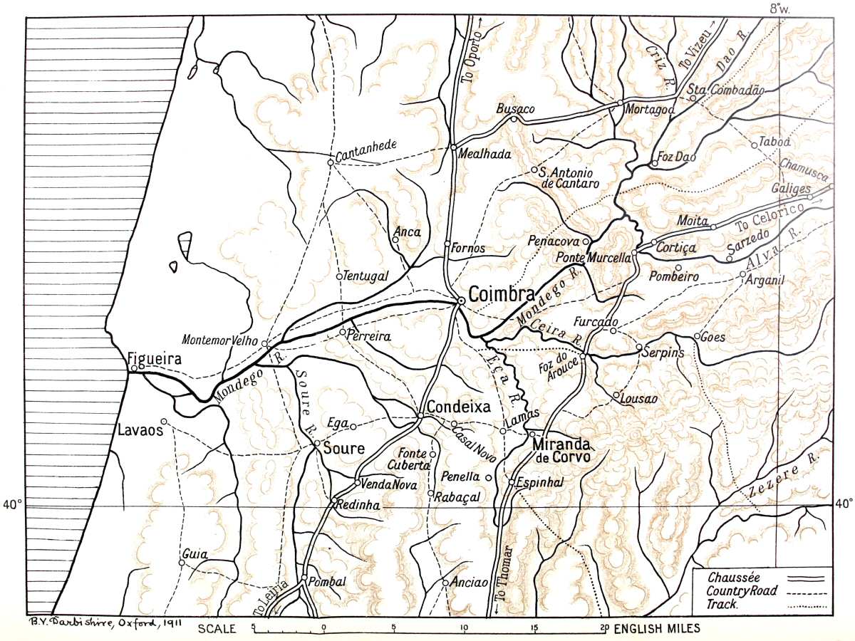 I must apologize to readers for some occasional discrepancies in spelling which may be discovered in the text and maps. They are mainly due to the fact that all along the Portuguese-Spanish frontier every town and village is spelt differently by its own inhabitants and by its close neighbours of the other nationality. I find it impossible to avoid the occasional intrusion of a Portuguese spelling of a Spanish locality, and vice versa. Matters are made still more hard by the fact that the spelling of local names in Portugal (less so in Spain) seems to have been much changed since 1811. It is difficult to avoid occasionally an archaic, or on the other hand a too-modern, form for a name. These slight errors, or discrepancies between names as spelled in the text and in the maps, were nearly all caused by alterations between the received spelling of 1811, followed in the maps I used, and that of 1911.[p. x] I do not think that they will cause any difficulty to the reader, who will not e. g. find it hard to recognize that Foz do Arouce is the same as Foz de Arouce or Casal Novo as Cazal Novo.