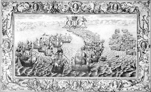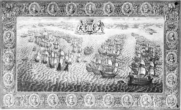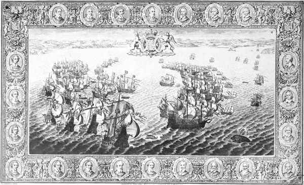 THE Defeat of the Spanish Armada being the most glorious Victory that was ever obtained at Sea, and the most important to the British Nation, every Method deserves some Praise, that may in a suitable Manner propagate the Memory of it. Our Ancestors, that were personally interested in it, were so careful it should not pass into Oblivion, that they procured the Engagements between the two Fleets to be represented in ten curious Pieces of Tapestry, with the Portraits of the several English Captains, taken from the Life, worked in the Borders, which are now placed, some in the Royal Wardrobe, some in the House of Lords, the most august Assembly of the Kingdom, there to remain as a lasting Memorial of the Triumphs of British Valour, guided by British Counsels. But because Time, or Accident, or Moths may deface these valuable Shadows, we have endeavoured to preserve their Likeness in the preceding Prints, which, by being multiplied and dispersed in various Hands, may meet with that Security from the Closets of the Curious, which the Originals must scarce always hope for, even from the Sanctity of the Place they are kept in.