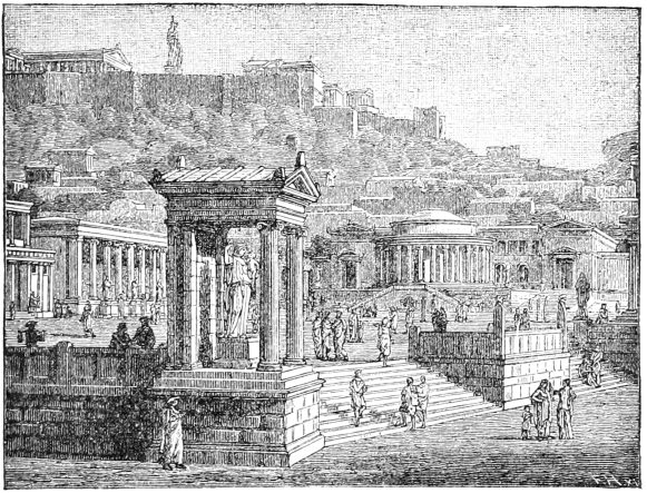 | The market of Athens at a later period, about 200 B. C. (In the upper part, in the background, is the Acropolis with the Parthenon, the colossal statue of Athene, and the Propylæa. To the left of the centre is a part of King Attalus’ hall, afterwards the Stoa Poecile, the circular Tholus, and behind, the Bouleuterium. In the foreground is a statue of Eirene, Peace, with the child Plutus in her arms; in the centre of the steps the square orator’s stage with hermae at the corners.) | 69 |