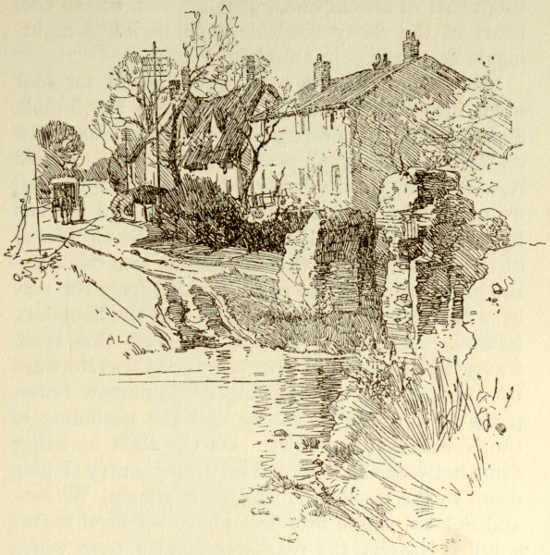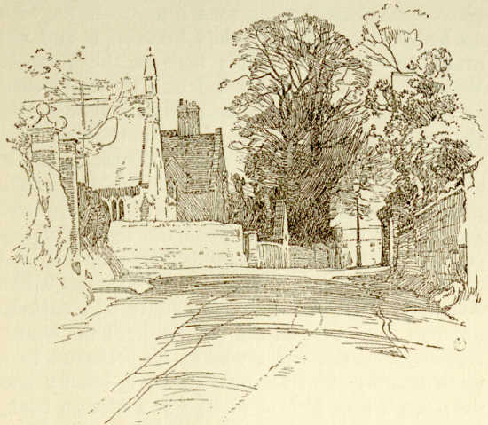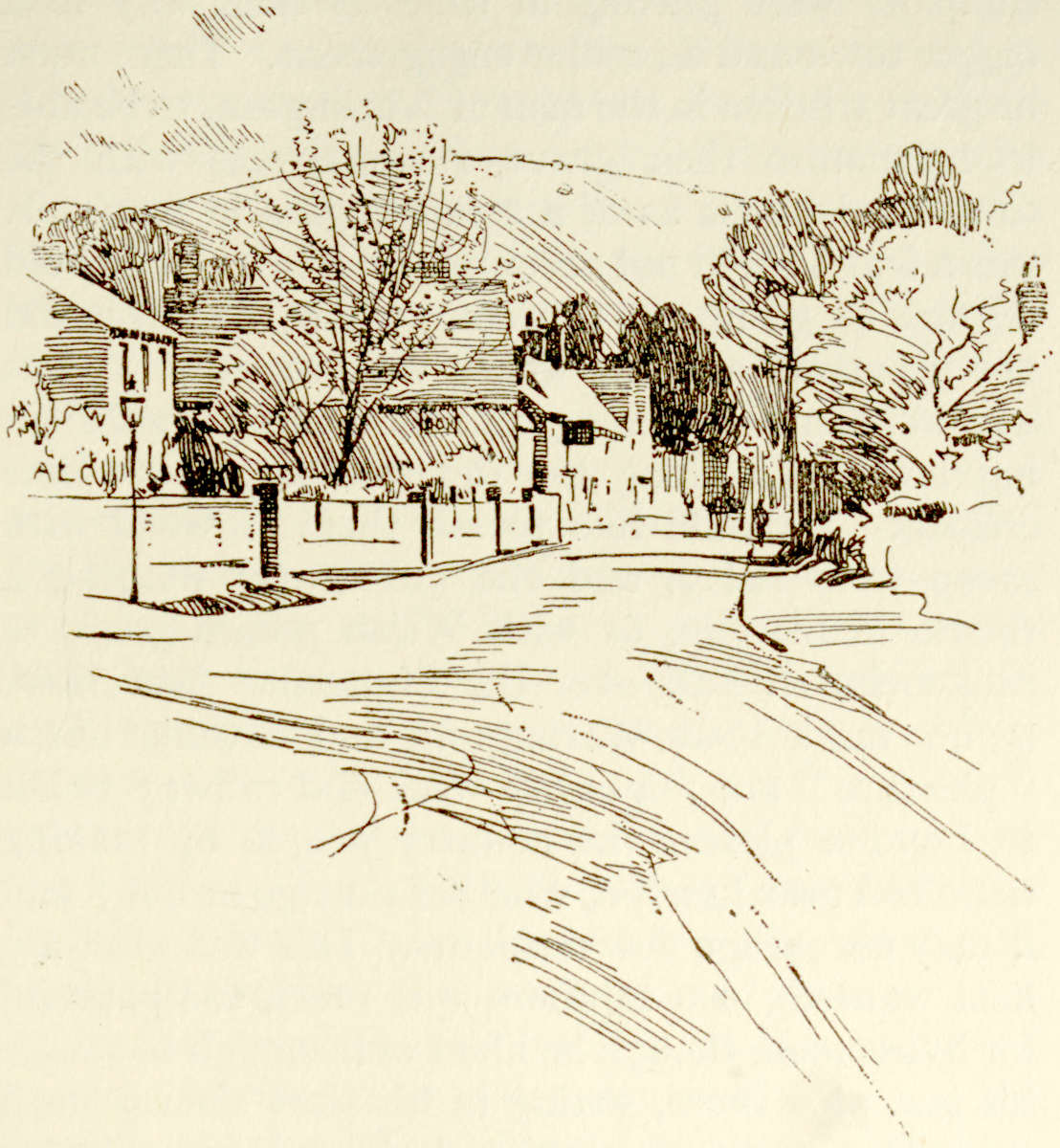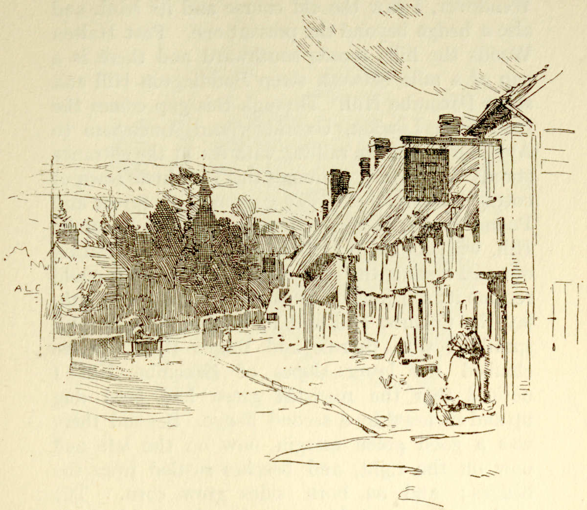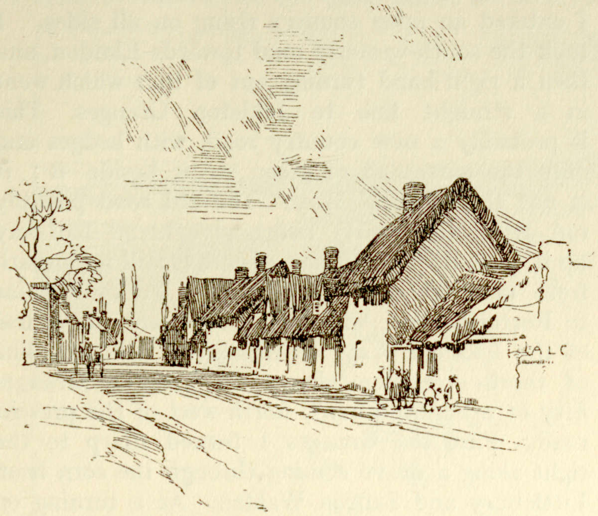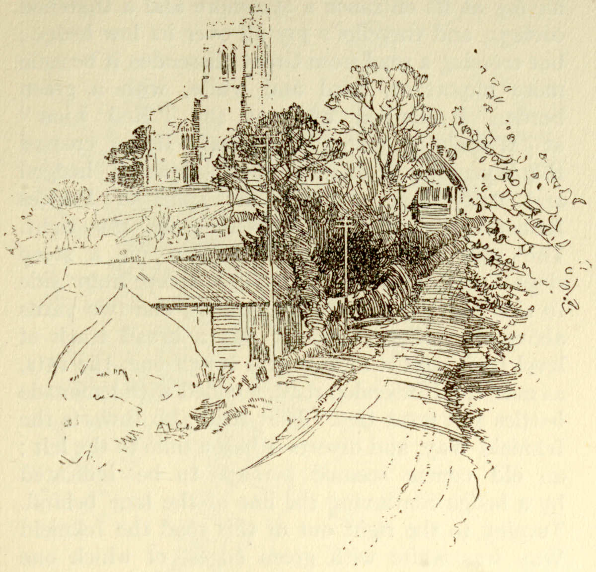 As I had had as much rain as I wanted on my skin, I turned downhill under a long train of[277] Lombardy poplars and very lanky ash trees into East Hendred for the night. It was a thatched village built on the slopes of a little valley, its houses standing snugly or in short rows high above either side of the steep streets. They stood high because the streets were very old and worn into deep hollows, and at the edges of these ran narrow, cobbled paths; but the cottages were still higher up, and four or five stone steps led up from the paths to their doors. At the bottom stood the towered[278] church, telling the hours and the quarters, not with clock-face and hands, but with bells. Rain, however, drowned that sweet noise in a mightier sweetness, heavy and straight rain, and no wind except what itself created. For half an hour everything—trees, mud walls, thatch, old weatherboards, pale-coloured, timbered cottages, the old chapel at a crossing railed off as a sign of private possession—everything was embedded in rain. Every sound was the rain. For example, I thought I heard bacon frying in a room near by, with a noise almost as loud as the pig made when it was stuck; but it was the rain pouring steadily off the inn roof. Then in the dripping quiet afterwards the sunset blazed in little fragments like gorgeous glass and metal betwixt the black garden foliage.