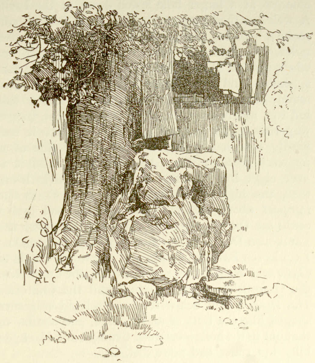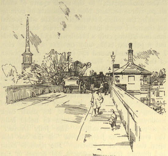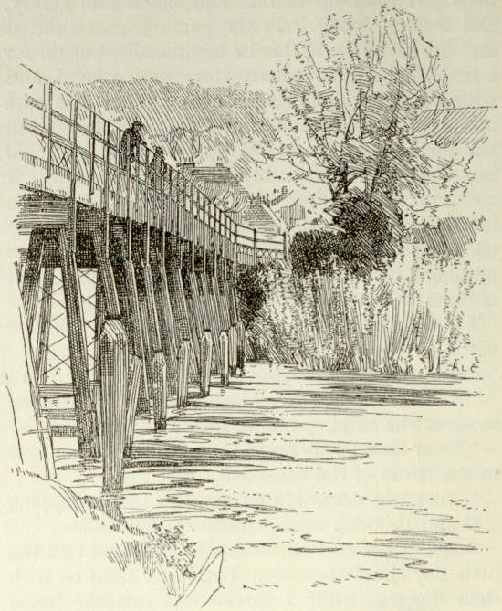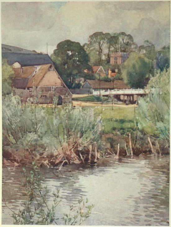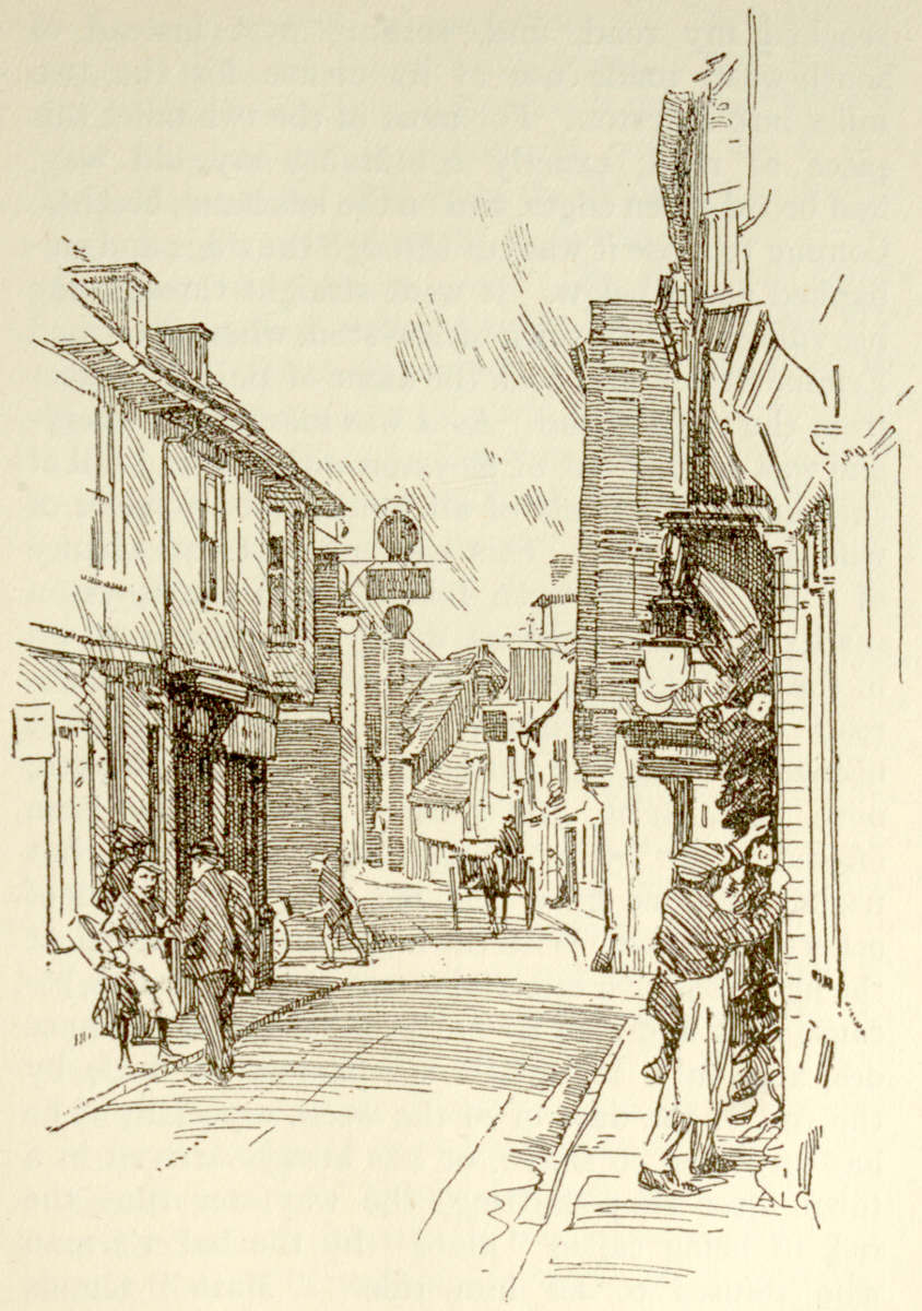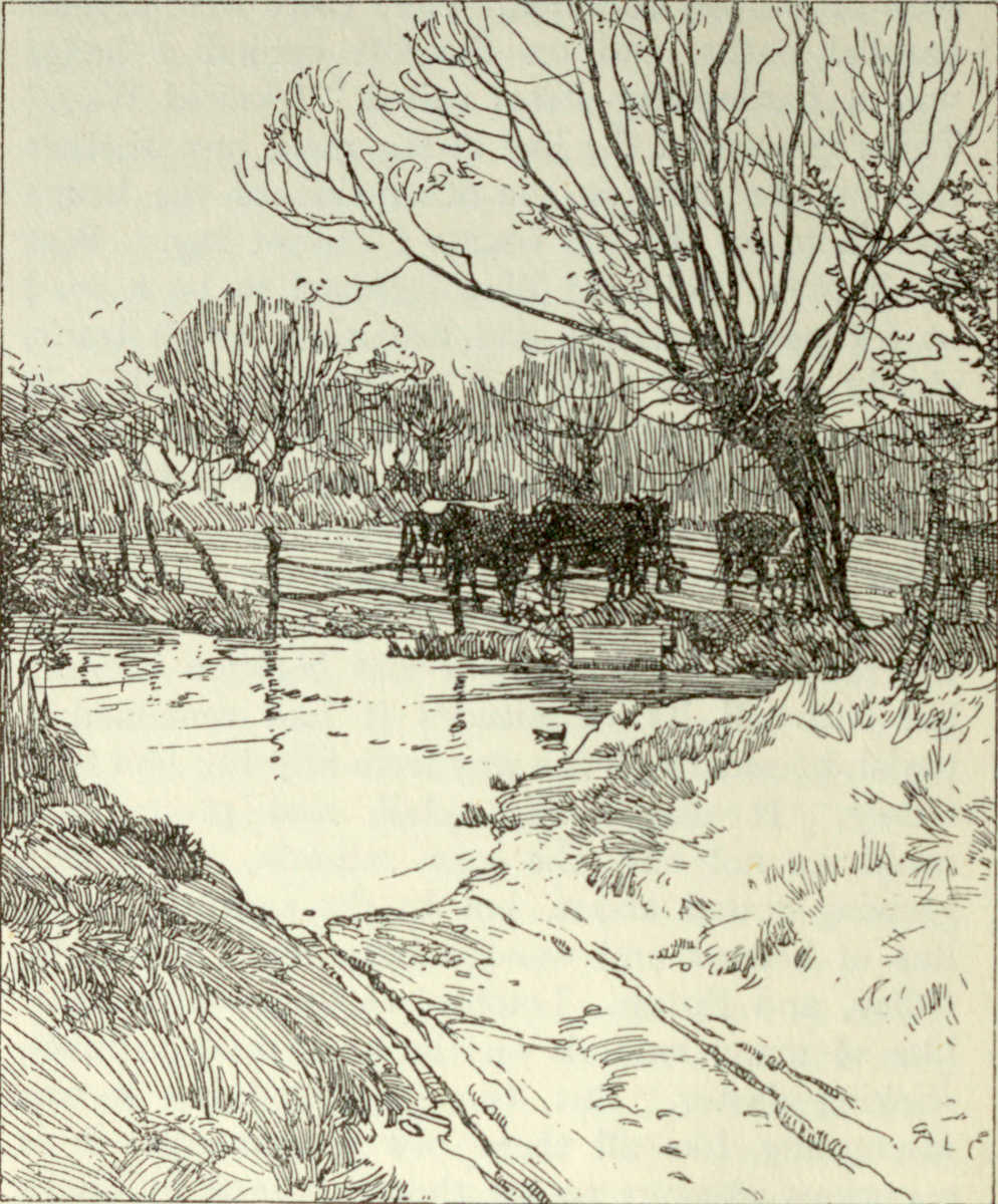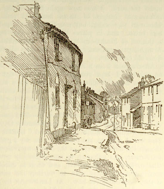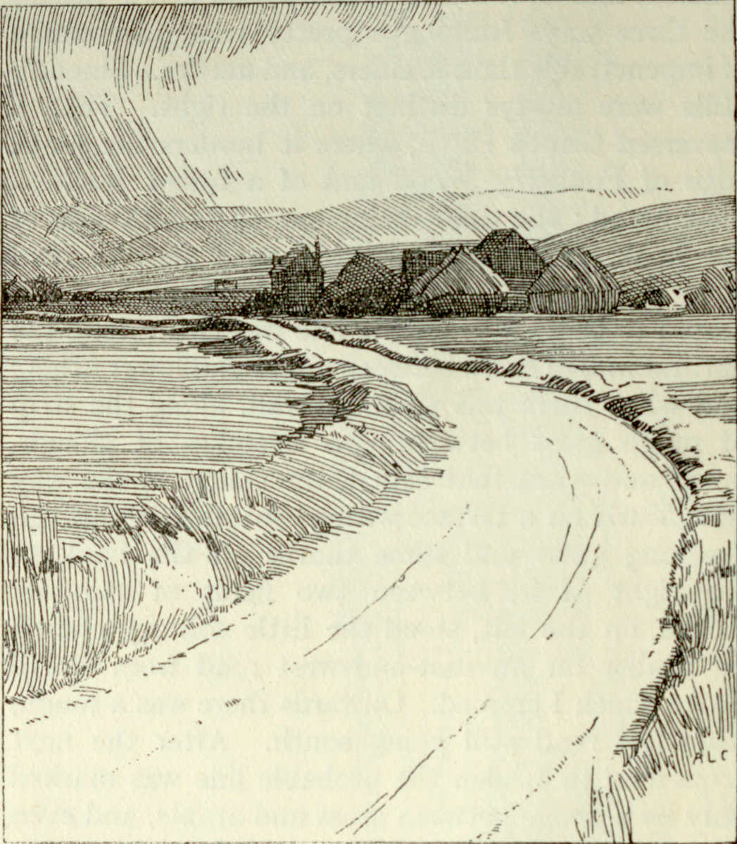 As I had had as much rain as I wanted on my skin, I turned downhill under a long train of[277] Lombardy poplars and very lanky ash trees into East Hendred for the night. It was a thatched village built on the slopes of a little valley, its houses standing snugly or in short rows high above either side of the steep streets. They stood high because the streets were very old and worn into deep hollows, and at the edges of these ran narrow, cobbled paths; but the cottages were still higher up, and four or five stone steps led up from the paths to their doors. At the bottom stood the towered[278] church, telling the hours and the quarters, not with clock-face and hands, but with bells. Rain, however, drowned that sweet noise in a mightier sweetness, heavy and straight rain, and no wind except what itself created. For half an hour everything—trees, mud walls, thatch, old weatherboards, pale-coloured, timbered cottages, the old chapel at a crossing railed off as a sign of private possession—everything was embedded in rain. Every sound was the rain. For example, I thought I heard bacon frying in a room near by, with a noise almost as loud as the pig made when it was stuck; but it was the rain pouring steadily off the inn roof. Then in the dripping quiet afterwards the sunset blazed in little fragments like gorgeous glass and metal betwixt the black garden foliage.