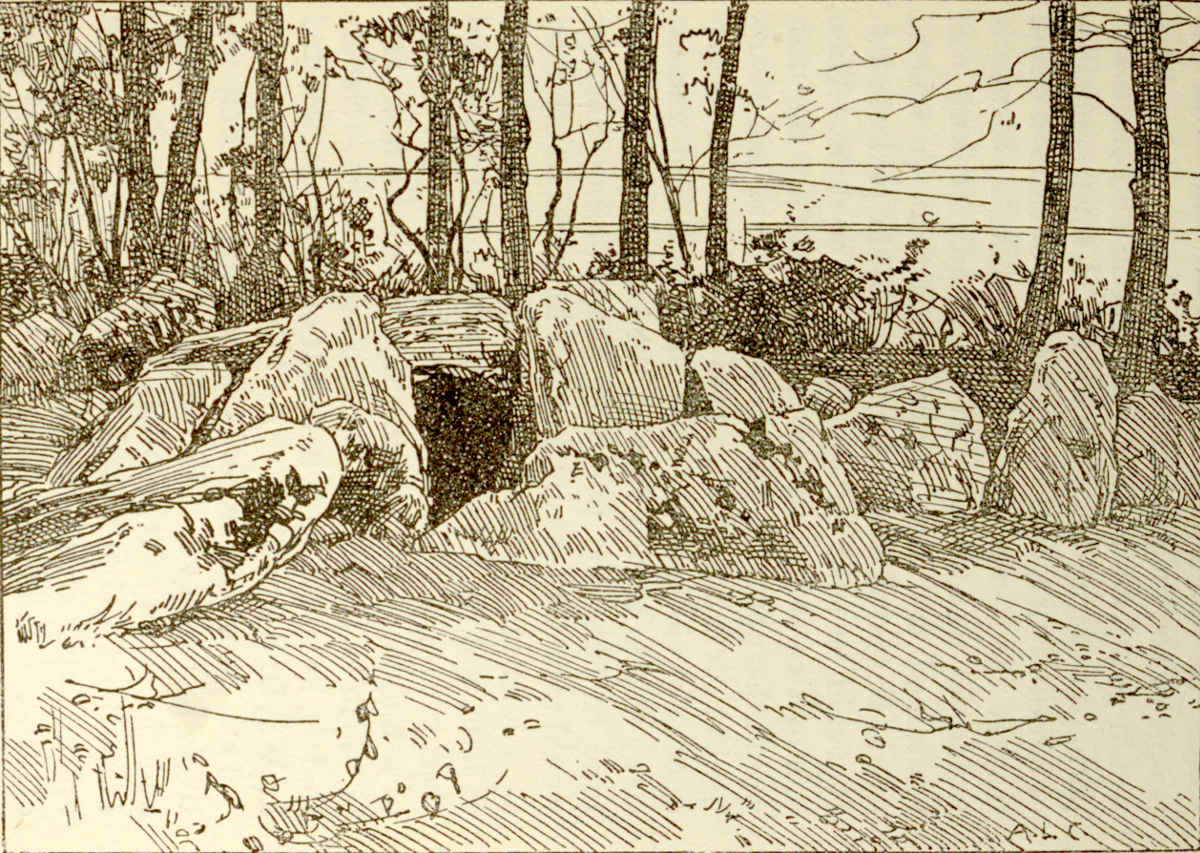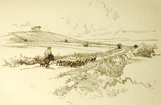 Ickleton Street ran for a third of a mile straight westward to a cross-track at the East and West Hendred boundary. It was hedgeless as before, and being on a slight depression the horizon was often[285] a very near one of corn, topped by a distant bright cloud or cloud-shaped dark clump of beech. At this cross-track I had to turn a few yards south and then westward along a track of the same kind. Not being sunk, or raised, or hedged, or banked, or ditched, the road could be ploughed up easily and its course slightly changed, as here, to serve a barn. This was Tames Barn, a thatched quadrangle of new ricks and old barns and sheds built of boards now heavily lichened. Past the barn it went as before, flat and hard-beaten, with broad ruts, and a slight dip on the right side—a wall not half as deep as the corn was high; there were a few blackthorns on this side. On the left sheep were folded in clover. Ahead the Lockinge Woods showed their tops between the rounds of Roundabout Hill, which was newly reaped, and Goldbury Hill, which was part stubble, part aftermath. At the first turning to West Hendred, which made the road crook a little to the south—and in this crook—there were two or three rough sarsens, iron-coloured but blotched with orange and dull silver, lying deep in the grass. A little way back I had noticed another on the left, and there was another, I think, east of Arfield Farm, beside the track.