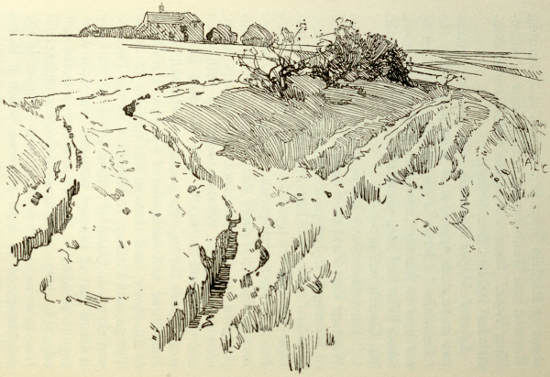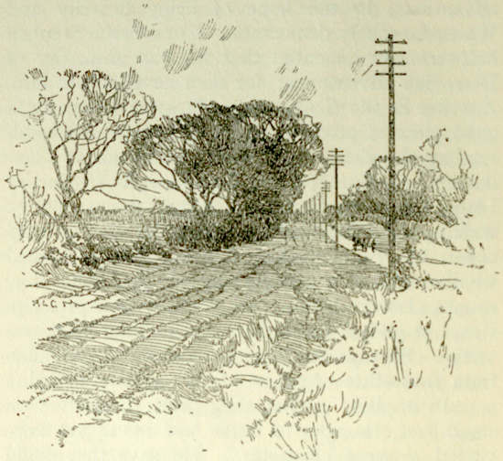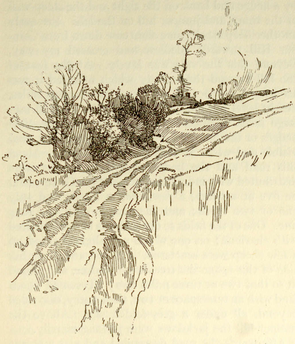 On the following morning early I returned to where I had left my conjectured road, which I shall now call Ickleton Street, at the crossing half a mile south of East Hendred Church. The eastern road at the crossing came from the south-east (out of Hungerford Lane) and was only for a few hundred yards in the line of Ickleton Street, falling into it a hundred yards or so west of Aldfield Common, where I had lost the road. The western road was apparently mine, but it was so unimportant for through traffic that though the eastern road forked on entering the northern or Hendred road, neither of the forks ran exactly into Ickleton Street. Between these forks was a triangular waste of yellow parsnip, wild carrot, and dock, uneven from digging, and somewhat above the roads which were sunken by downhill wearing.