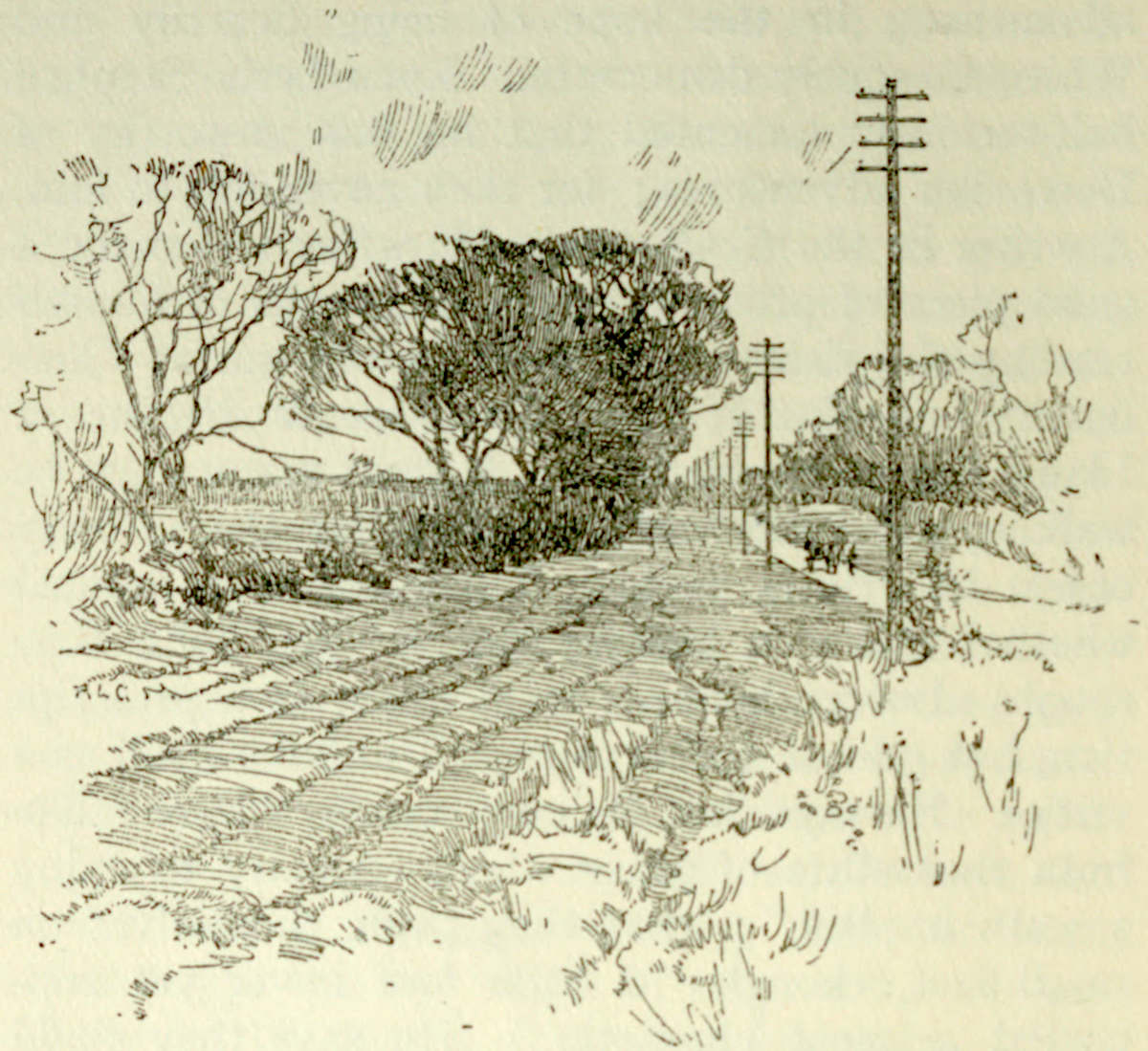 The making of such roads seems one of the most natural operations of man, one in which he least conflicts with nature and the animals. If he makes roads outright and rapidly, for a definite purpose, they may perish as rapidly, like the new roads of modern Japanese enterprise, and their ancient predecessors live on to smile at their ambition. These are the winding ways preferred by your connoisseur to-day. “Give me,”[5] says Hazlitt, “the clear blue sky over my head and the green turf beneath my feet, a winding road before me, and a three-hours’ march to dinner—and then to thinking!” These windings are created by the undulating of the land, and by obstacles like those of a river—curves such as those in the High Street of Oxford, which Wordsworth called “the stream-like windings of that glorious street.” The least obstacle might bring about a loop, if nothing more, and as even a Roman road curled round Silbury Hill, so the path of the Australian savage is to be seen twisting round bush after bush as if it enjoyed the interruption, though it cannot purl like the river at a bend. Probably these twists, besides being unconsciously adapted to the lie of the land, were, as they are still, easeful and pleasant to the rover who had some natural love of journeying. Why go straight? There is nothing at the end of any road better than may be found beside it, though there would be no travel did men believe it. The straight road, except over level and open country, can only be made by those in whom extreme haste and forethought have destroyed the power of joy, either at the end or at any part of its course. Why, then, go straight? The connoisseur had something of the savage in him when he demanded a winding road.