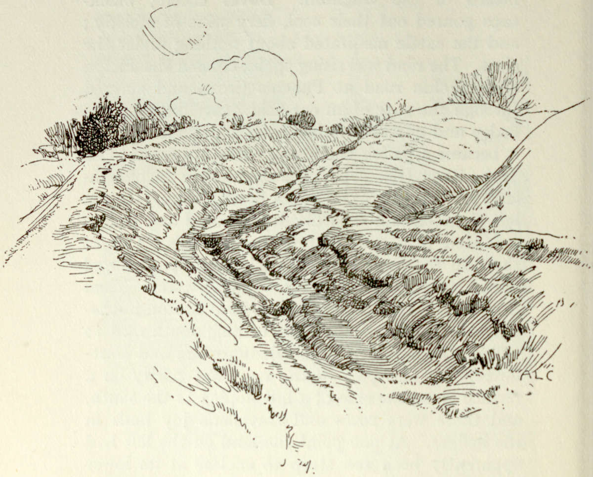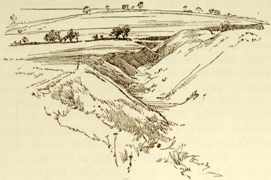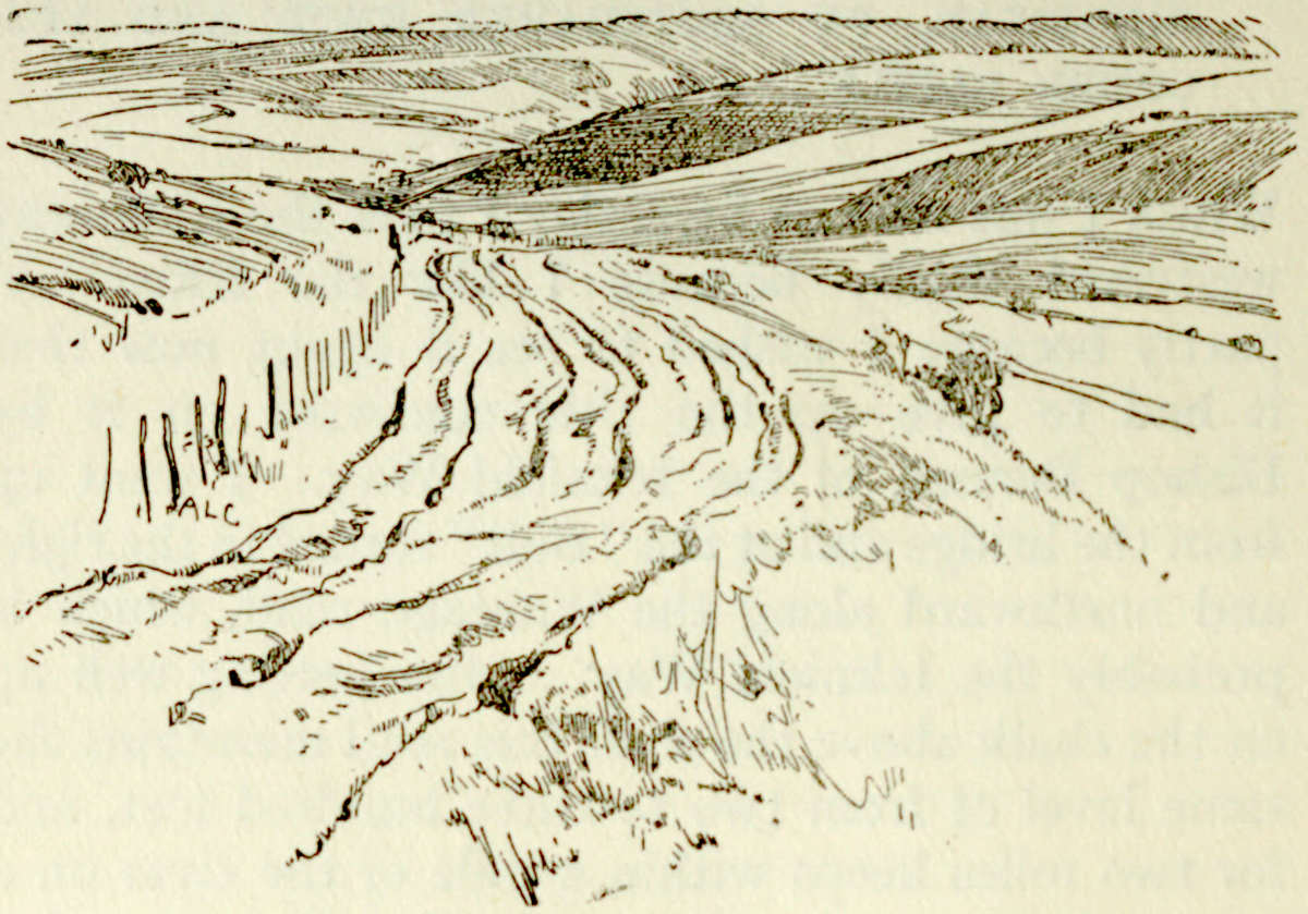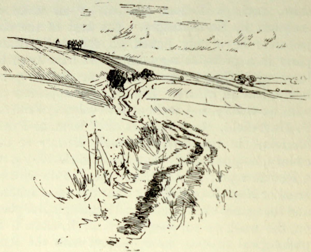 At Bishopstone the road twisted right and left almost as at Ashbury. This was into a coombe with a little stream in it, and there were some signs that the old way had rather been left and right—that is, sloping down to the ascending bottom of the coombe and up again—as in other coombes. But the coombe and the bare Downs about it were so shaped by nature, by wearing, and apparently by deliberate but inexplicable cutting, that a mere road could not be traced with certainty. The coombe branched as it rose up into the Downs and formed several enormous convexities and concavities of turf. Several of their converging slopes were cut evenly into three or four, or nearly a dozen, green terraces like staircases, all of which, had a company of giants sat there, would have given a view of the spring-head below.