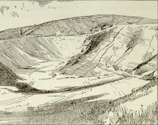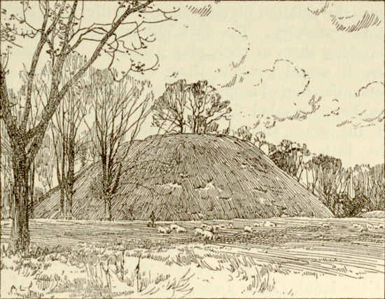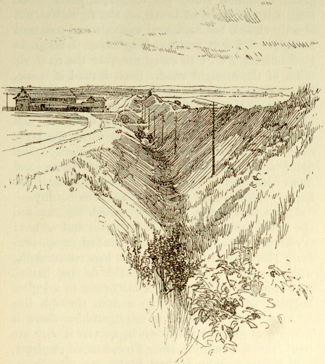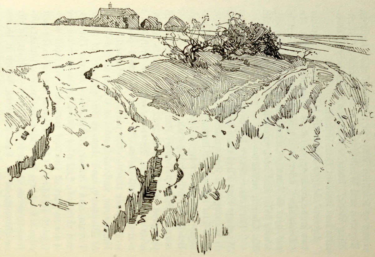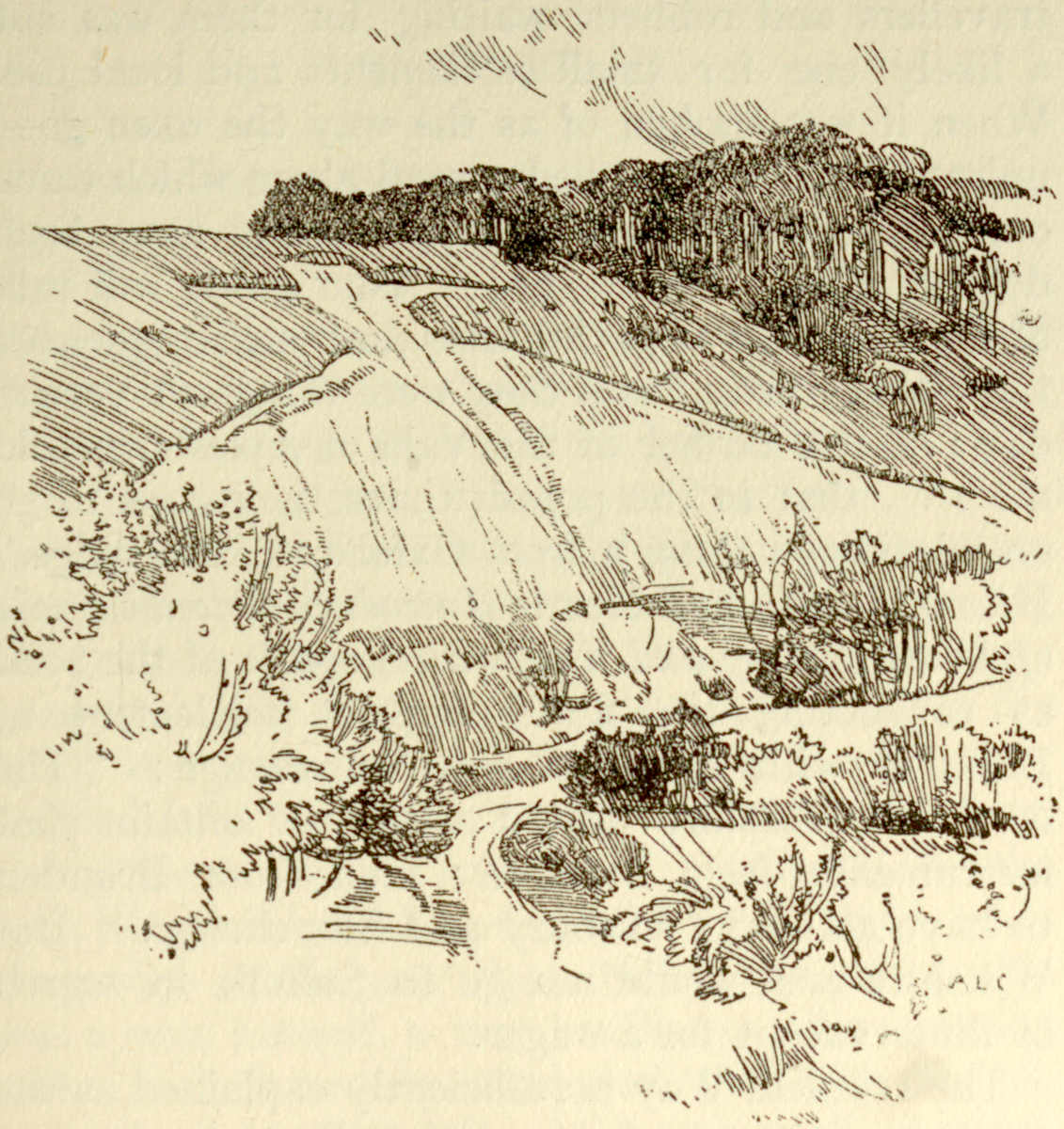 At Bishopstone the road twisted right and left almost as at Ashbury. This was into a coombe with a little stream in it, and there were some signs that the old way had rather been left and right—that is, sloping down to the ascending bottom of the coombe and up again—as in other coombes. But the coombe and the bare Downs about it were so shaped by nature, by wearing, and apparently by deliberate but inexplicable cutting, that a mere road could not be traced with certainty. The coombe branched as it rose up into the Downs and formed several enormous convexities and concavities of turf. Several of their converging slopes were cut evenly into three or four, or nearly a dozen, green terraces like staircases, all of which, had a company of giants sat there, would have given a view of the spring-head below.