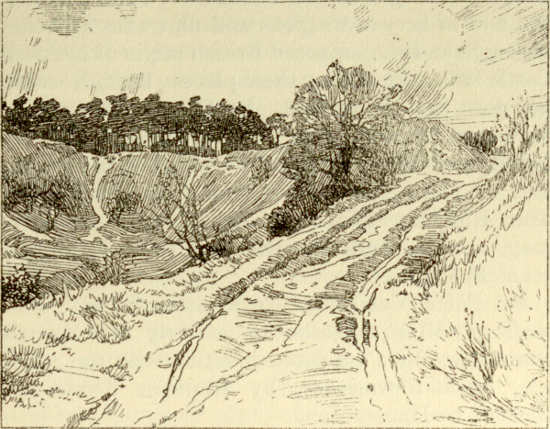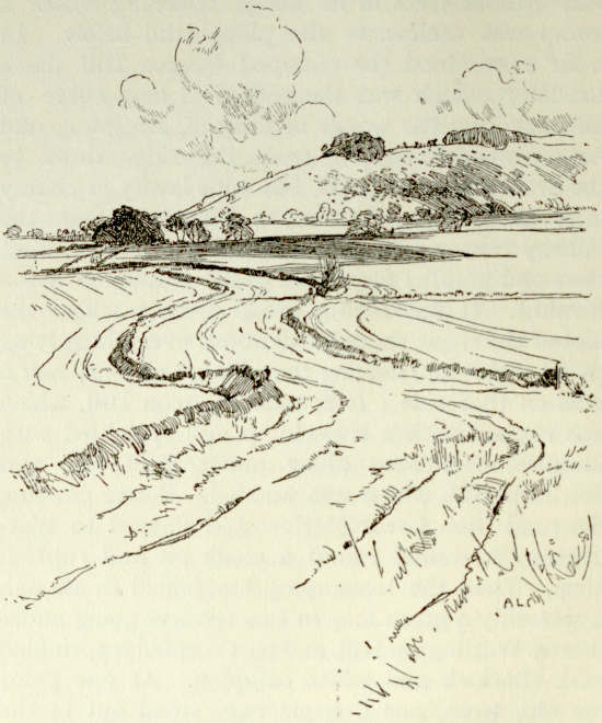 The right-hand hedge gave way to show me the elms and thatched barns and ricks of Ashbury, its church tower among trees rather apart and nearer the Downs. The road descended under a steep left-hand bank, with a green course parallel. It turned right and then left round some elm trees and past a hollow on the right containing a broad millpond enclosed in a parallelogram of elms. At Ashbury the road turned to the right away from the church to the “Rose and Crown,” and the two elm trees standing in mid-street, and then back again to the left into its original line. But parallel with the road a footpath ran from the church on a terrace just wide enough for a waggon. It had a green wall above and below, grass on the left, sweet-smelling lucerne on the right. It rose and fell more than the road as it made for Idstone between the barley. The terrace seemed to be continued across the deeply worn road from Swinley Down; but the path turned to the right and into the main road. This terrace road seemed to be a very possible[297] course for an old, though perhaps only an alternative road.