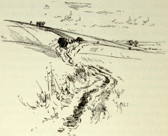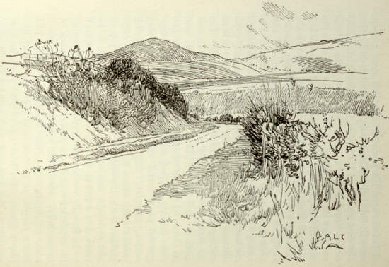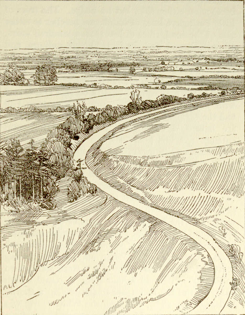 Even as towns are built by rivers, instead of rivers being conducted past towns, so the first settlements grew up alongside roads which had formerly existed simply as the natural lines of travel for a travelling race. The oldest roads often touch the fewest of our modern towns, villages, and isolated houses. It has been conjectured that the first roads were originally the tracks of animals. The elephant’s path or tunnel through the jungle is used as a road in India to-day, and in early days the wild herds must have been invaluable for making a way through forest, for showing the firmest portions of bogs and lowland marshes, and for suggesting fords. The herd would wind according to the conditions of the land and to inclinations of many inexplicable kinds, but the[3] winding of the road would be no disadvantage to men who found their living by the wayside, men to whom time was not money. Roads which grew thus by nature and by necessity appear to be almost as lasting as rivers. They are found fit for the uses of countless different generations of men outside cities, because, apart from cities and their needs, life changes little. If they go out of use in a new or a changed civilization, they may still be frequented by men of the most primitive habit. All over England may be found old roads, called Gypsy Lane, Tinker’s Lane, or Smuggler’s Lane; east of Calne, in Wiltshire, is a Juggler’s Lane; and as if the ugliness of the “uggle” sound pleased the good virtuous country folk, they have got a Huggler’s Hole a little west of Semley and south of Sedgehill in the same county: there are also Beggar’s Lanes and roads leading past places called Mock Beggar, which is said to mean Much Beggar. These little-used roads are known to lovers, thieves, smugglers, and ghosts. Even if long neglected they are not easily obliterated. On the fairly even and dry ground of the high ridges where men and cattle could spread out wide as they journeyed, the earth itself is unchanged by centuries of traffic, save that the grass is made finer, shorter, paler, and more numerously starred with daisies. But on the slopes down to a plain or ford the road takes its immortality by violence, for it is divided into two or three or a score of narrow courses, trenched so deeply that they might often seem to be the work rather of some fierce natural[4] force than of slow-travelling men, cattle, and pack-horses. The name Holloway, or Holway, is therefore a likely sign of an old road. So is Sandy Lane, a name in which lurks the half-fond contempt of country people for the road which a good “hard road” has superseded, and now little used save in bird’s-nesting or courting days. These old roads will endure as long as the Roman streets, though great is the difference between the unraised trackway, as dim as a wind-path on the sea, and the straight embanked Roman highway which made the proverb “Plain as Dunstable Road,” or “Good plain Dunstable”—for Watling Street goes broad and straight through that town. Scott has one of these ghostly old roads in Guy Mannering. It was over a heath that had Skiddaw and Saddleback for background, and he calls it a blind road—“the track so slightly marked by the passengers’ footsteps that it can but be traced by a slight shade of verdure from the darker heath around it, and, being only visible to the eye when at some distance, ceases to be distinguished while the foot is actually treading it.”