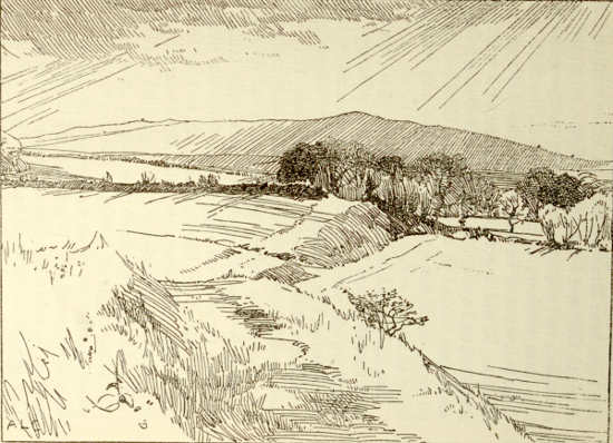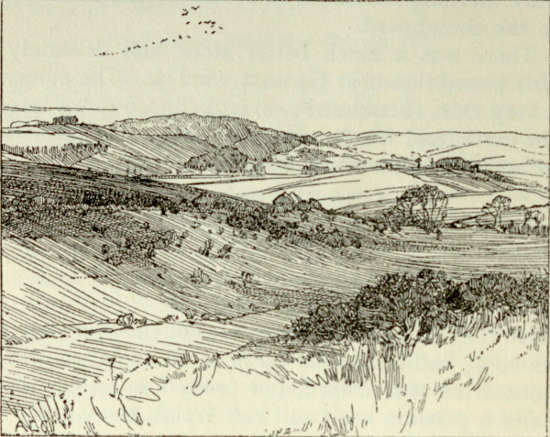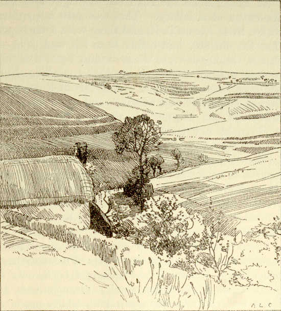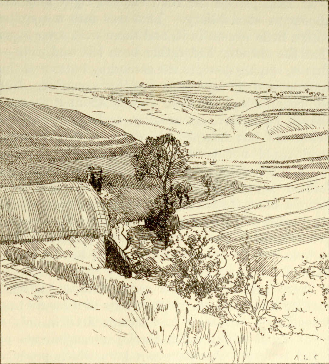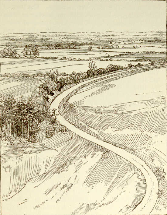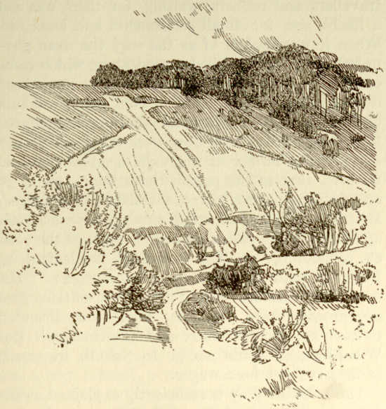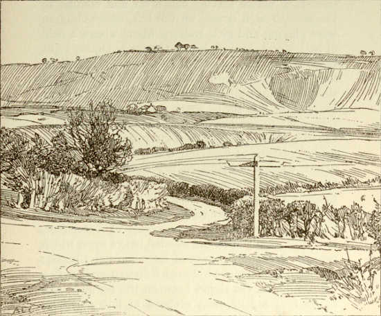 My road was a narrow one, and at first borderless and worn to some depth below the neighbouring fields. At the top of its ascent out of Wantage it had a bank on the right, a fence on the left instead of hedges. After passing Ickleton House at a right-hand turning, I reached two cottages on the right at the crossing of a road from Faringdon to Letcombe. This I entered on the south side to look for a road between mine and the hills. A parish boundary follows this road, and also the lane which I turned into on the right almost at once. The lane was green and ran under some beeches and a natural turf wall south-westward. It was deep worn and rutted as it descended through the corn and barley to a cross-track under another turf wall making from Letcombe Regis Church to Childrey. I went on until my track became a hard road to Lambourn, and as I had seen no sign of an alternative to the “Roman Way,” I turned to the right and entered it again at the crossing for Childrey and Letcombe Bassett. Elms clustered at the crossing, and the road was deeply worn between grassy banks. It continued to have hardly any green edge, and as it was usually rising or falling it was sunk more or less below its original level; in one place, for example, the left bank was nearly twenty feet high, and I could see nothing but the clouds all sopped[291] in sunlight. The land was almost entirely arable on either side, with standing corn or stooks or stubble. In one place, past the turning on the right to Westcott, which is between Sparsholt and[292] Kingston Lisle, the road was on a terrace, having a bank on the left and falling on the right to corn and a thatched farm under trees: there were elms and beeches on either side, but no hedge. The trees of Lisle Park gave lines of handsome beeches to either side of the road, trees of less than a hundred years, all well-shaped and, in fact, almost uniform, and planted at reasonable intervals. The ridge of the Downs was not a mile distant, and from it the grass of a yellowish green colour undulated without a break to the road, sprinkled with beeches and barred with fir plantations. Past the Blowingstone Hill and the turning to Kingston Lisle these undulations are bare and carved by a steep-walled natural cutting. At this point the top of the Downs was only half a mile away, and thenceforward it was never more than a mile until beyond Bishopstone. Actually the nearest point to the ridge was perhaps where the road twisted sharp to the left to the bottom of a coombe and then sharp back again to get out of it. As the floor of the coombe sloped upwards into the hill, these twists gave a road which was bound to cross it at the lowest possible gradient. The coombe had steep, smooth sides of yellowish grass and a winding flat floor, and through the big scattered thorns and elders of it a track went down to Fawler. The road wound again to round a high bank on the left and again to circumvent a thorny hollow on the right, and soon the White Horse was coming into view. There were woods steep above on the left; there had been hedges on both sides since Blowingstone Hill, often bushy and thick and [294] overscrambled by climbers, as, for example, near Britchcombe Farm. Here the road had a green, sunken course divided from the hard one by a thicket. This farm-house and its thatched, white-stone dependencies, their trees, their elders and nettles, stood close to the road, but a little back from it and a little above it, under the almost precipitous ash wood of the hill; and away from it on the other side of the road sloped another coombe of thorns, and also of willows and some water.