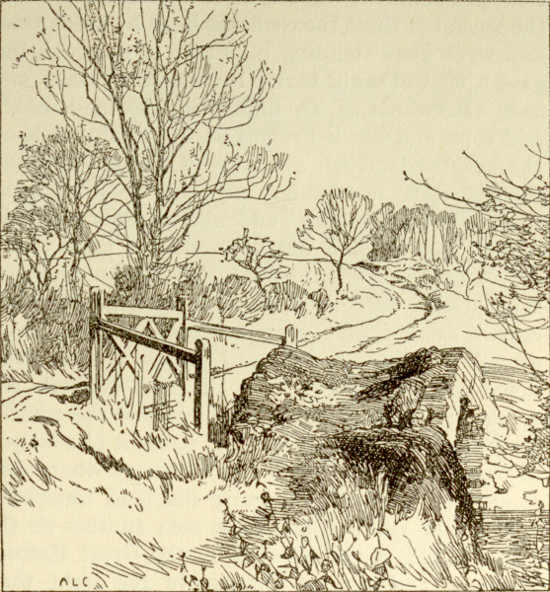 Past Arfield Farm the road had hedges until it came to the tussocky little “Arfield Common,” so called, but perhaps not so in fact. Here there were several forking cartways. Mine seemed to go westward along the northern hedge and its traveller’s joy, but at the west side of the common, where Cow Lane comes in from Hendred, there was a gap of a hundred yards or so before the old line was taken up by a road from the south-east, which led me into the road to East Hendred. This was a little more than three miles from the beginning of the road at Upton.