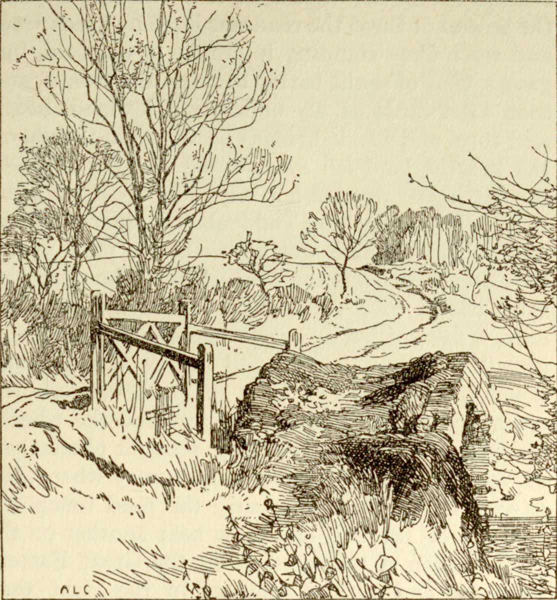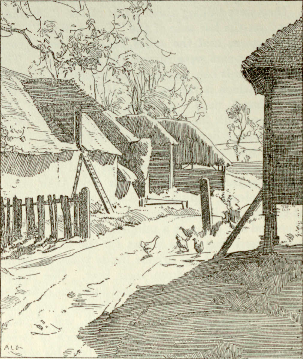 The turning eastward out of this road by East Lockinge post office was in line with Ickleton Street, but signs of an exit from the park on the opposite side of the road were obliterated by cottages and gardens. This turning I took, and when it curved decidedly to the right a footpath on the left, between a hedge and some allotment gardens, pre[287]served its original line. This path led westward into a road coming south from Goddard’s Barn. On the right-hand side of the entering of the path into this road lay the good house of West Lockinge Farm, its barn and sheds and lodges gathered about it on one side of the road, and its ricks and elm trees opposite. The road was half farm-yard and half road and littered with straw and husks, where the fowls were stalking and pecking with a laziness that seemed perfectly suited to a Sunday early morning following a blazing harvest Saturday.