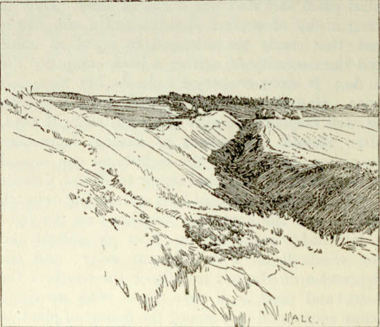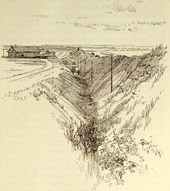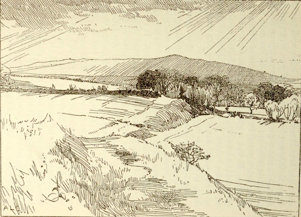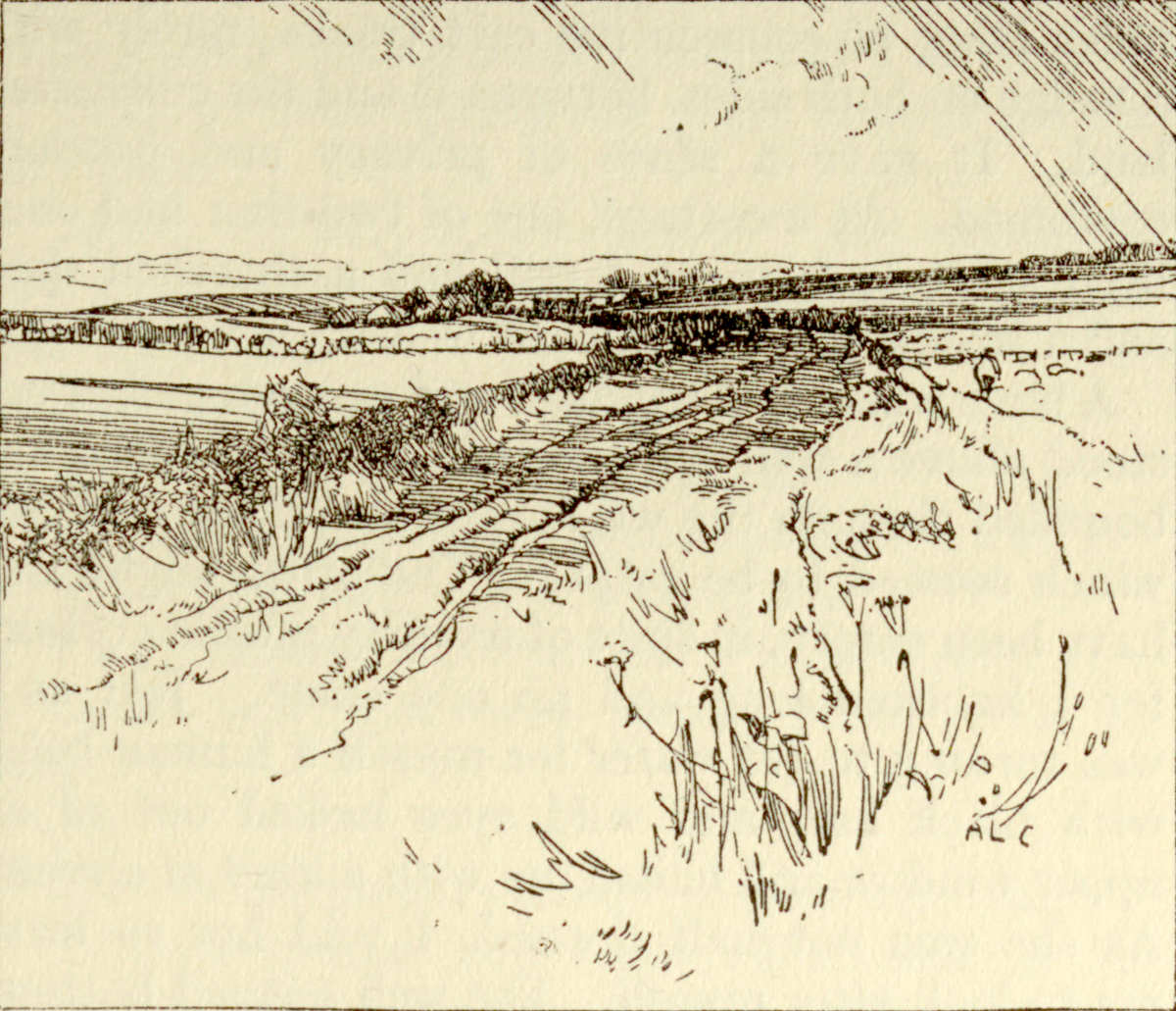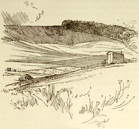 Crossing the Letcombe brook I was out again between hedges and in the company of telegraph posts on the road to Ashbury, Bishopstone, and Swindon, which is called in the inch Ordnance Map “Roman Way.” It seemed the only continuation of Ickleton Street, and as there was no other road with anything like the same course in the valley I had little doubt that it was the “Icleton-way” of the early eighteenth century going “all under the hills between them and Childrey, Sparsholt and Uffington, so under White Horse Hill, leaving Woolston and Compton on the right, thence to Ashbury and Bishopston.” The foot of the Downs was about a mile on the left, and between them and the road the cornland dipped considerably. Looking over the hedge I saw first a broad land of grass and then a line of telegraph wires making for Letcombe and[290] dividing the grass from a broad band of ripe corn; beyond that was a band of very green roots; then a band of newly ploughed earth; then stubble dappled with dark corn stacks, and above them the hill.