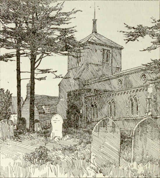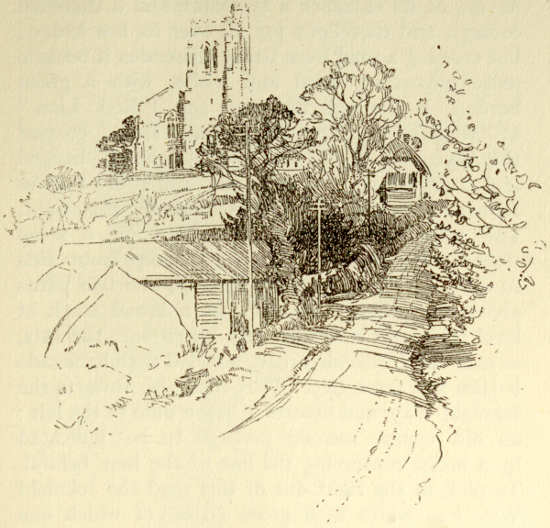 Liddington clump, the straight ridge and the “castle” rampart upon it, were clear ahead as I took this turning. Wanborough’s towered and spired church stood at the top of a slope of grass on my right. It was a crooked, hedged road, with a grassy edge and a path on the grass; and the telegraph posts followed it. It passed out of Wanborough parish at a tiny stream that crossed the road in a deep, narrow cleft with willows and willow herbs below on the right, and in the widening cleft a derelict mill, a steep garden plot, and a row of beehives. It rose up narrow, deep, and steep to the “Bell” at Liddington. There I turned to the[304] left into the Swindon road, and almost at once to the left again, leaving the church on my left. This took me past two or three houses of Medbourne, and sharp to the left and right through the hamlet of Badbury, where a great elm stands at the first turning above a deep hollow and a road going northward down it to the right. Then crossing the Roman road from Mildenhall to Wanborough Nythe, I was at Chisledon and another cleft in the land. This cleft is often precipitous, and so narrow that you could almost play cards across it. A streamlet and a single line of railway wind along the bottom. The church stands at the edge where it is gentler, and the village is scattered over the slopes and edges.