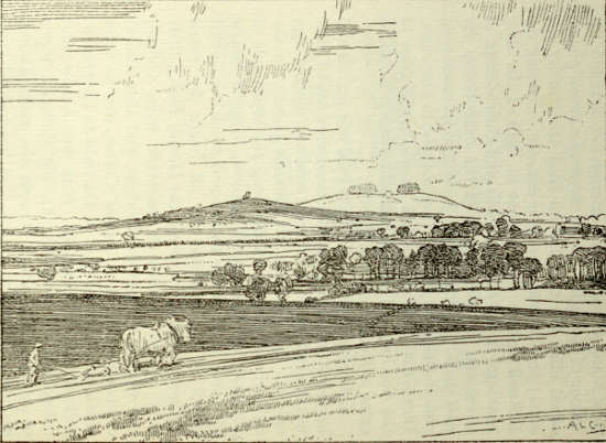 My conjectural road began as a hedged lane that formed a short cut into the road to East Ilsley and Newbury. Crossing that road it was a cart track—with a disused, parallel course on the right—over Hagbourne Hill, past Hagbourne Hill Farm, which was derelict, but had sunflowers in the garden and ricks in the yard. Less than a furlong south of the farm is a supposed Roman burial-ground. A home-returning carter told me that the first part of the road as far as the crossing was Baits or Bates Lane. It was a cart track, or usually a strip of three or four parallel cart tracks, going parallel with the downs, and almost straight between one road and the next that came from over the downs northward to the villages. It could easily make a straight course, like all the other roads round about, because it was on an almost unbroken plateau of cornland at the foot of the downs: so level was this piece of country that in about four miles the altitudes varied only between three hundred and eighty and four hundred feet. Between me and the downs there were seldom any trees, except such few as stood by Downs Farm, its thatched barns, its old and new ricks. On the right a slight swell in the land often shut out everything but distant Oxfordshire under a blue, bulging threat of storm. The road was for the[276] most part without hedges, and not a parish boundary. It was rarely or never sunken, but in places might have been a little embanked. On one side, shortly before reaching the Newbury road, there were two old thorns. Half a mile farther, after crossing Hungerford Lane—a track from Milton Hill to Farnborough—it had a line of elm trees on its left, which was part of the enclosure of Arfield Farm, close by. I thought Arfield—on the new one-inch Ordnance Maps spelt Aldfield—might be the same as Halvehill. The cottage pronunciation, except that it lacked an aspirate, was not discouraging. Halvehill barn was said to be on the Ickleton Street or Meer, but on inquiry I learnt that it was some way from my road down Hungerford Lane to the north, but on this side of the main road, which was here about a mile distant. This barn is now called Horn Down Barn.