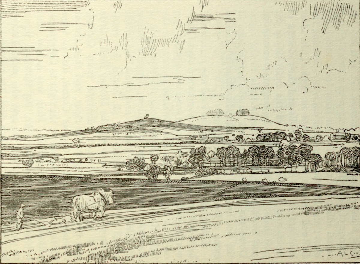 At the crossing to Shrivenham and Lambourn I caught sight of the crest and haggard beech clump of Barbury above the nearer hills. This crossing was within a quarter of a mile of Compton Beauchamp, the last of more than half a dozen villages which the road passed by on its right hand without touching. Ashbury was the first village traversed by the road since Upton. As I approached Ashbury through corn that now ran right to the top of the Downs, I had a bank above me on the left and one below me on the right, and I could see now both Liddington [296] and Barbury clumps, and to the left of Liddington one high, bare breast of turf. A lesser road turned down to Odstone Farm, which I was very glad to see again, not a quarter of a mile on my right—its five plain windows in a row, two in the roof, and those below not to be counted because of the garden shrubs. It was a grey, stone house with a steep, grey roof and a chimney stack at either side; there were elms behind it, and tiled and thatched sheds all on its right hand; and the road going straight down to its left side.