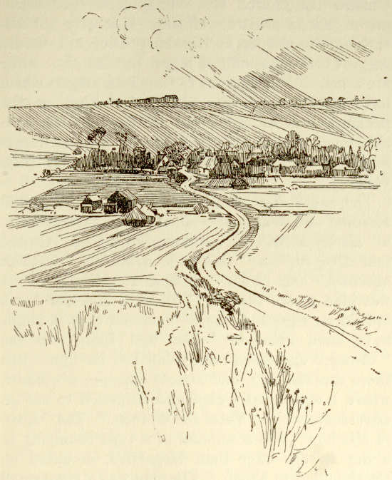 Here the dust was thick, and I was glad to feel, to hear, to smell and to taste, and to see the rain falling as I passed the “Barley Mow” at Blewbury. According to custom I stood under the broad, overhanging eaves of one of Blewbury’s thatched roofs and watched the rain, but it was better to be in it and to smell the wetted dust which association alone has made pleasant. Any road was good now, though mine was an unadventurous, level, probably commercial, road.