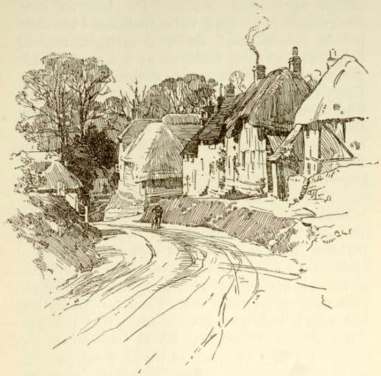 The village, the mill, and the church were lower down to the right below the spring, on the modern road and its northward branches. Only a cottage, with a thatched roof on a level with my feet, lay near the green coombe track above the water. The road went on again between corn and roots, westwards now, and gradually farther from the Downs, until a cross-road from Bourton cut across it and sent it southwards a quarter-mile by a willowy spring before it turned west again.