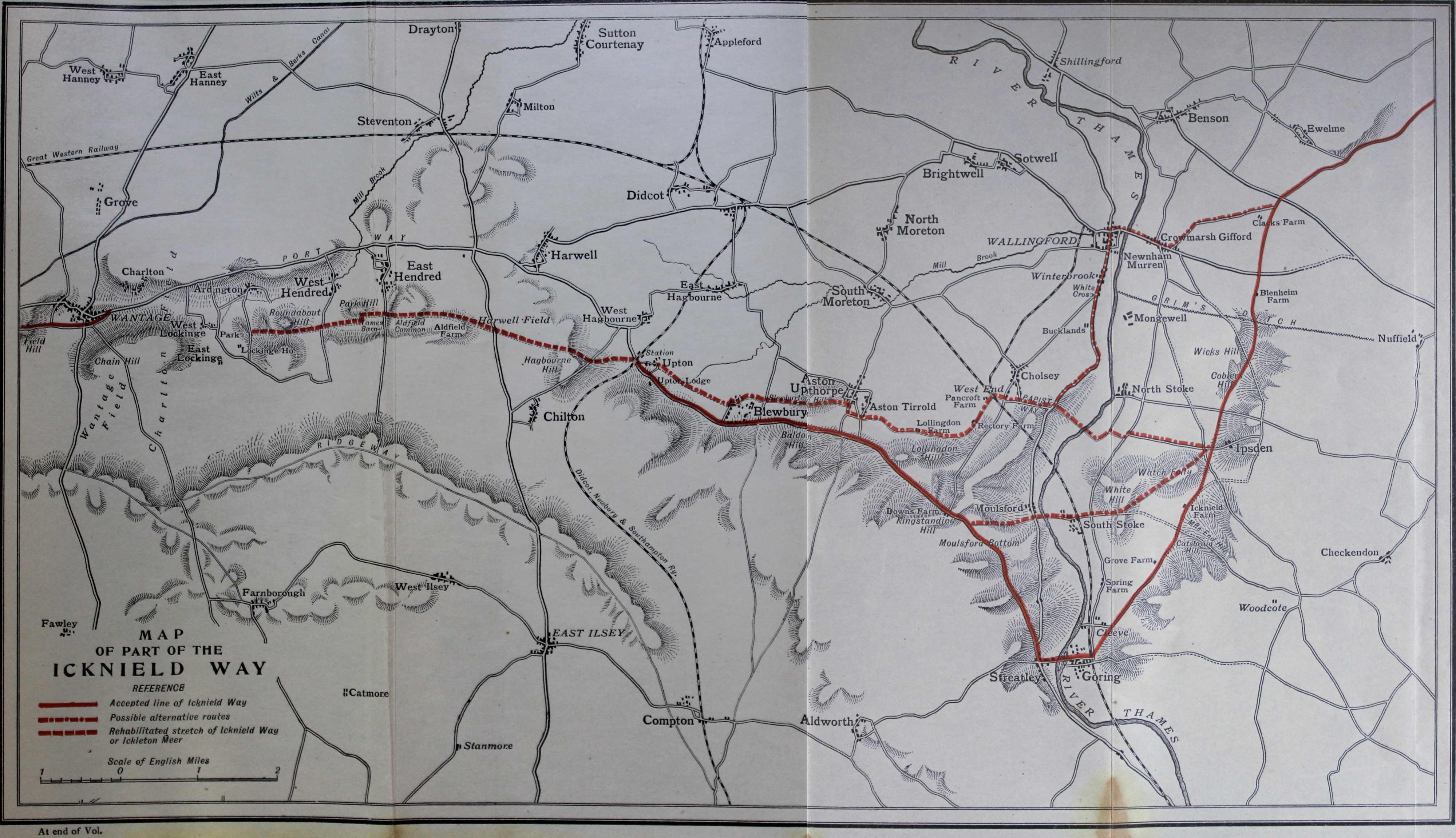 When I started from Streatley to see the western half of the Icknield Way it was with several uncertainties. I knew that the Icknield Way was not the Ridgeway, but a lower road which was in several places not more than a mile or two away from it. This lower road, it has been said, was the Wantage-to-Reading turnpike for part at least of its course; one writer’s road clearly lay south of this turnpike; another had expressed a doubt whether it was the turnpike or a road to the south. The decision that the Icknield Way in Berkshire was distinct from the Ridgeway had added this difficulty; that the Ridgeway, supposing it to have come up from the ford at Streatley, must have been a road from beyond the Thames, and what that road was I had not discovered, though it had been suggested that it was the Upper Icknield Way. But if the Icknield Way of Oxfordshire and the Icknield Way of Berkshire were linked, it must have been at Streatley, though it may also have been at other fords.