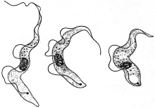 Trypanosoma gambiense, the parasite of Sleeping-sickness, very highly magnified. The occurrence of three kinds of individual, as shown in the figure, appears to be characteristic of this and certain other species of Trypanosoma.