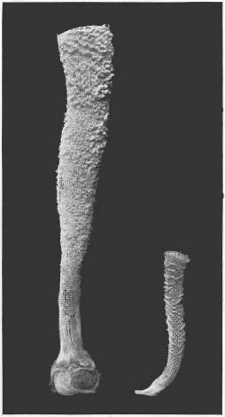 At the eastern end of the gallery are the Pterosauria or Ornithosauria, commonly called Pterodactyles or Flying Reptiles. Their most gigantic representatives were the species of Pteranodon from the Upper Cretaceous of Kansas (fig. 53). At the west end is the nearly complete skeleton of Pariasaurus (fig. 52) from the Karoo formation (Trias) of South Africa. It occurs also in Russia, and belongs to a primitive section of the Theromorphs, or Anomodonts, which include the ancestors of Mammals.