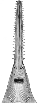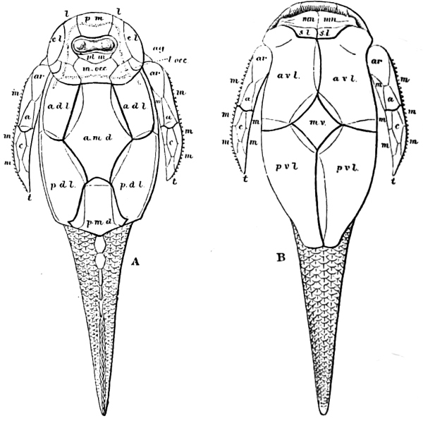 Of the galleries running northwards from the Fossil Reptile gallery, the one nearest to the central hall is used for the display of the Fossil Fishes, many belonging to groups now extinct. Perhaps the most remarkable of all, and certainly most unlike existing forms, are the armoured Devonian Fishes known as Cephalaspis, Pterichthys (fig. 54), etc. The well-preserved fishes from the Chalk are especially noteworthy, and a specimen of Portheus in a central case, 14 feet in length, is one of the largest bony fishes known.